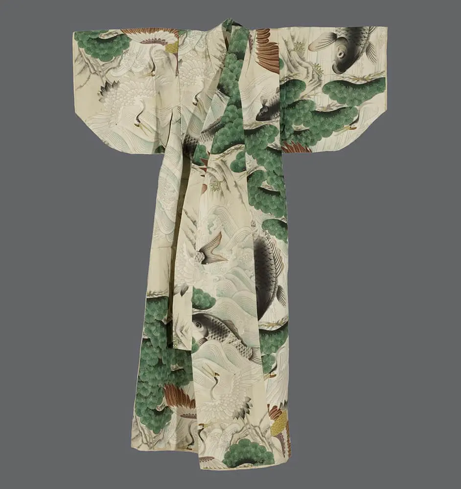 This fine, small silk boy's kimono showcases images of carp and pines. It measures approximately 23 inches (58 cm) from sleeve-end to sleeve-end and 31 inches (79 cm) in height. Despite its small size, the kimono is in very good condition, with only minor imperfections. The images of carp and pines add a charming and traditional touch to this adorable garment.