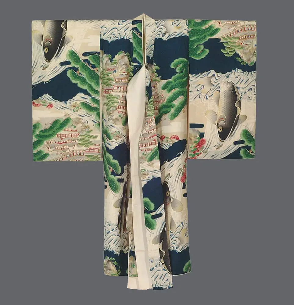 This striking boy's silk kimono features captivating depictions of castles and wonderfully-rendered carp. It includes surihaku gold-foil outlining and comes with a plain juban undergarment as part of the set. Both pieces are in very good condition, with measurements of 33 inches (84 cm) from sleeve-end to sleeve-end and a height of 37 inches (94 cm).