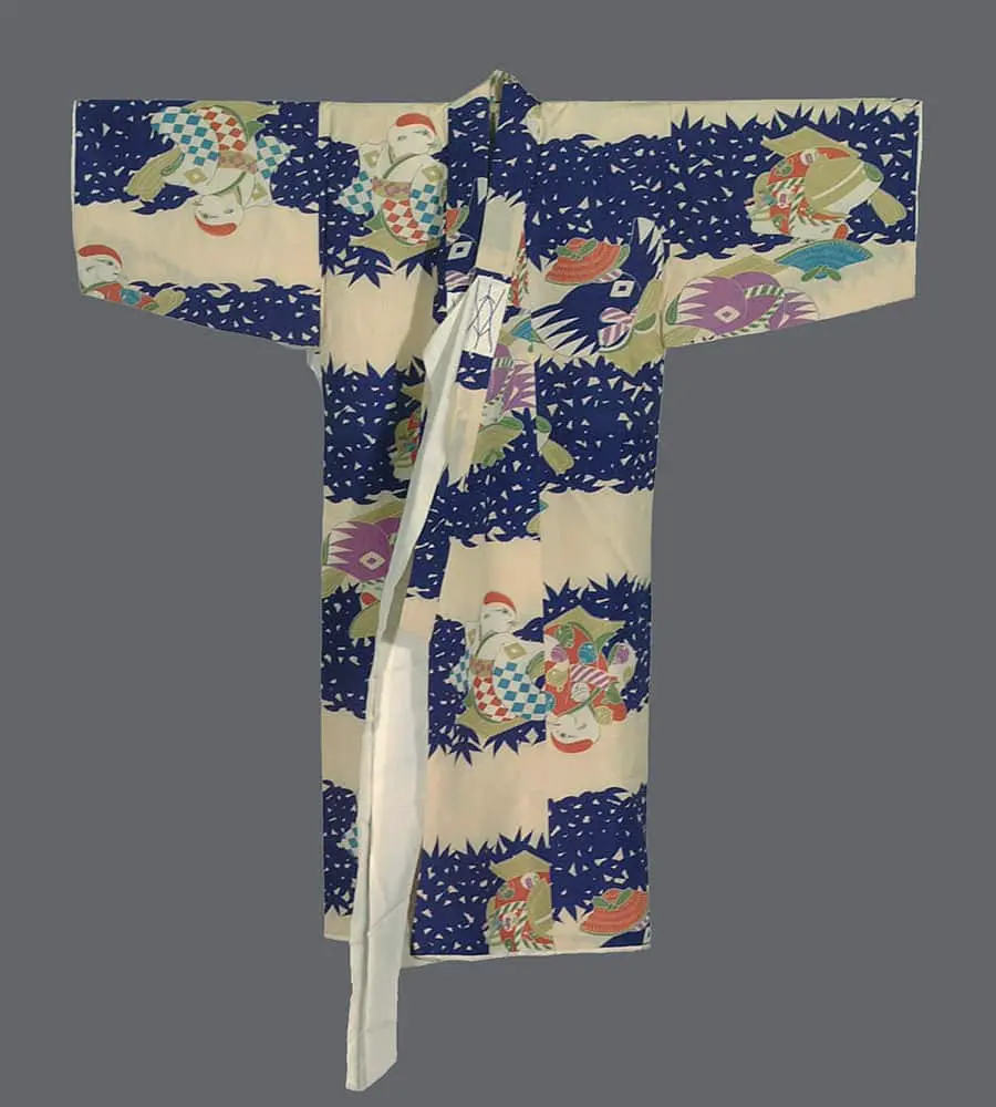 This boy's silk kimono features amusing sparrows dressed in kimonos. It's in very good condition, measuring 31 inches from sleeve-end to sleeve-end by 31 inches in height (79 cm by 79 cm).