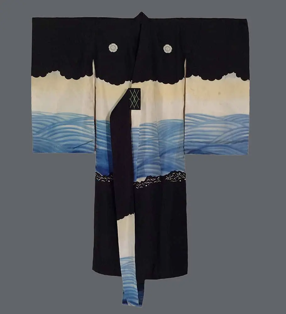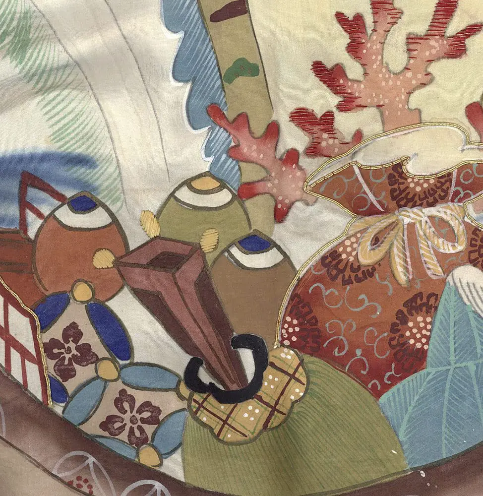 This boy's miyamairi (Shinto christening) silk kimono showcases depictions of ships carrying traditional treasures: a wish-granting mallet, a bottomless purse, a cape of invisibility, coral, and a rhinoceros horn, all symbols of good fortune. It's in very good condition, measuring 31 inches from sleeve-end to sleeve-end by 39 inches in height (79 cm by 99 cm).