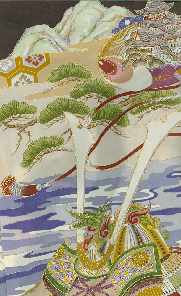 This miyamairi kimono, used for a baby boy's Shinto ceremony, showcases motifs like samurai helmets, cranes, and castles on a plain silk fabric. The material has a dry, slightly stiff texture and is embellished with embroidery couching and gold foil outlining. Despite discreet foxing, it remains in very good condition. Its measurements are approximately 31 inches (79 cm) from sleeve-end to sleeve-end and about 38 inches (97 cm) in height.