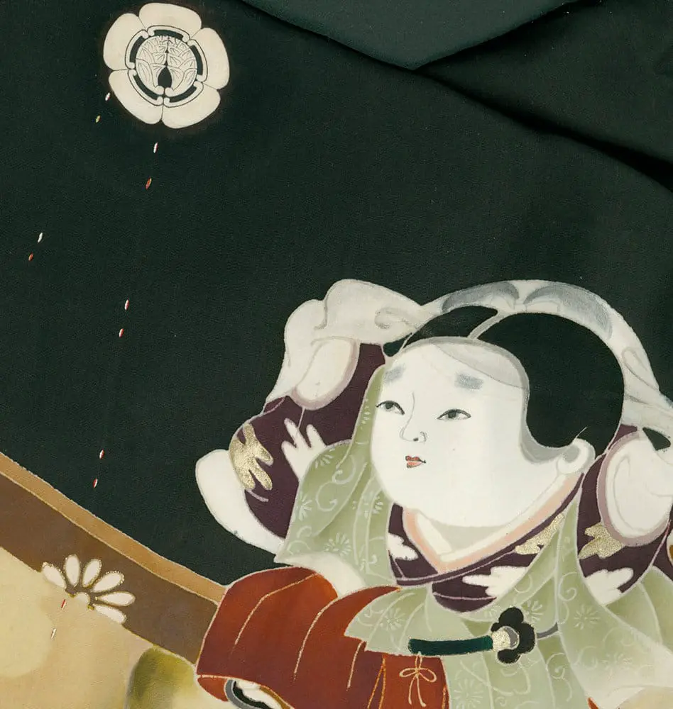 The narrative scenes likely depicting Momotaro (the legendary Peach Boy) and a female figure demonstrate the continued importance of folkloric themes in Japanese decorative arts of this period. The figures are rendered in the classical Japanese painting tradition, with clean lines, minimal shading, and expressive facial features that echo ukiyo-e woodblock print aesthetics. The yuzen dyeing technique creates smooth color gradations and precise detail work, while the freehand painting adds spontaneous artistic touches that prevent the design from appearing overly mechanical.