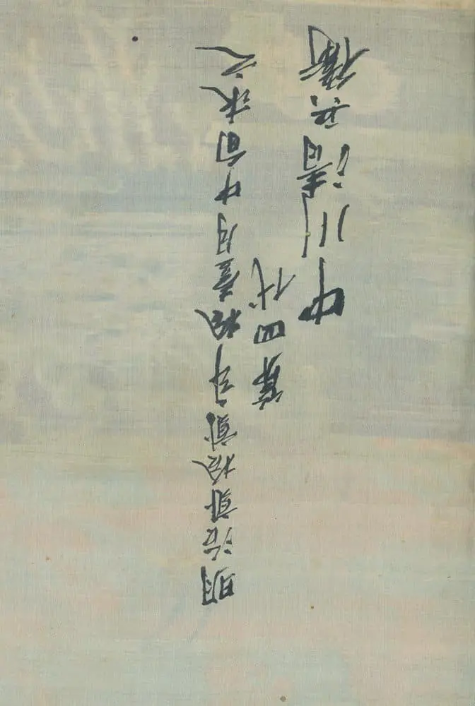 The white silk lining features kanji figures indicating the initial dedication in the year 1854 (Ansei 1) and a rededication in 1890 (Meiji 22). It's in good condition, aside from several tiny round pinholes and a light stain in one corner. The uchishiki measures 26 inches by 26 inches (66 cm x 66 cm).