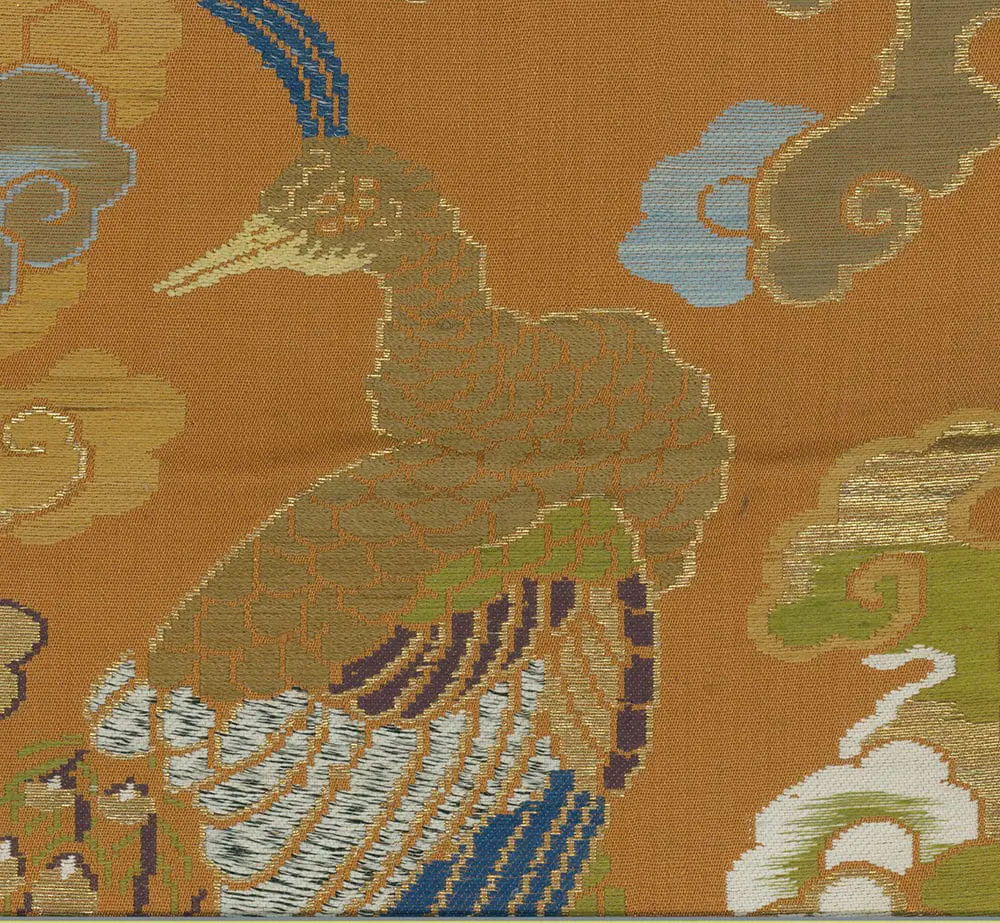 This silk brocaded uchishiki showcases various auspicious Buddhist motifs. The clouds, laden with religious symbolism from Buddhist and Taoist origins, are a representation of divine authority and often appear as five-colored clouds signifying a Buddha descending to earth. The peacock symbolizes dignity and beauty, the phoenix embodies virtues like duty, correct behavior, humanity, and reliability, while the crane signifies longevity.