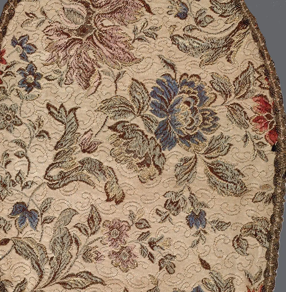 This satin brocade features a restrained application of metallic threads, highlighted by a narrow edging laced with metallic thread. Its backing consists of a hand-woven baby blue linen fabric, creating an overall soft and fluid texture. Measuring approximately 15 inches (38 cm) in width and 8.5 inches (22 cm) in height, the front of the piece is in very good condition, while the linen backing shows some staining.
