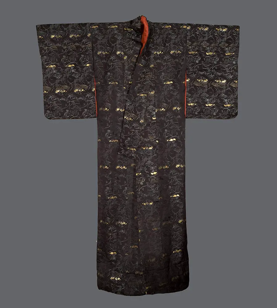 Its inner orange-red lining exhibits several silk splits, although these are concealed when the uchikake is worn or displayed. Measuring 48 inches (122 cm) from sleeve-end to sleeve-end, this uchikake stands tall at a height of 64 inches (163 cm).