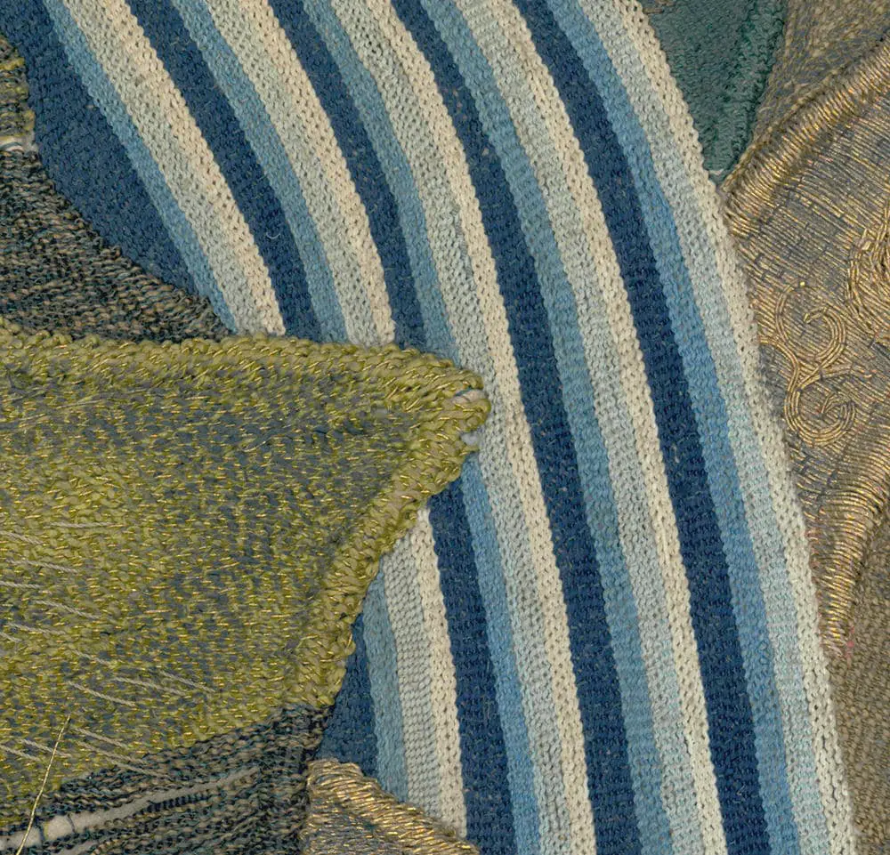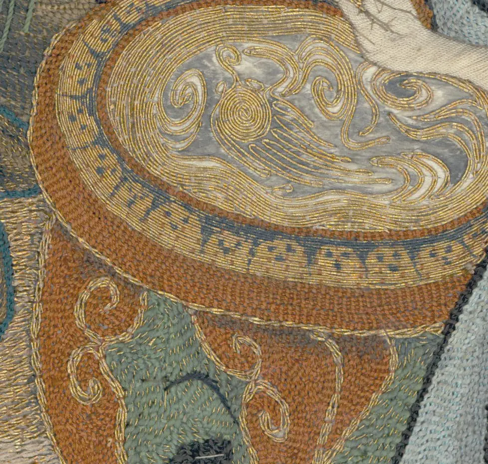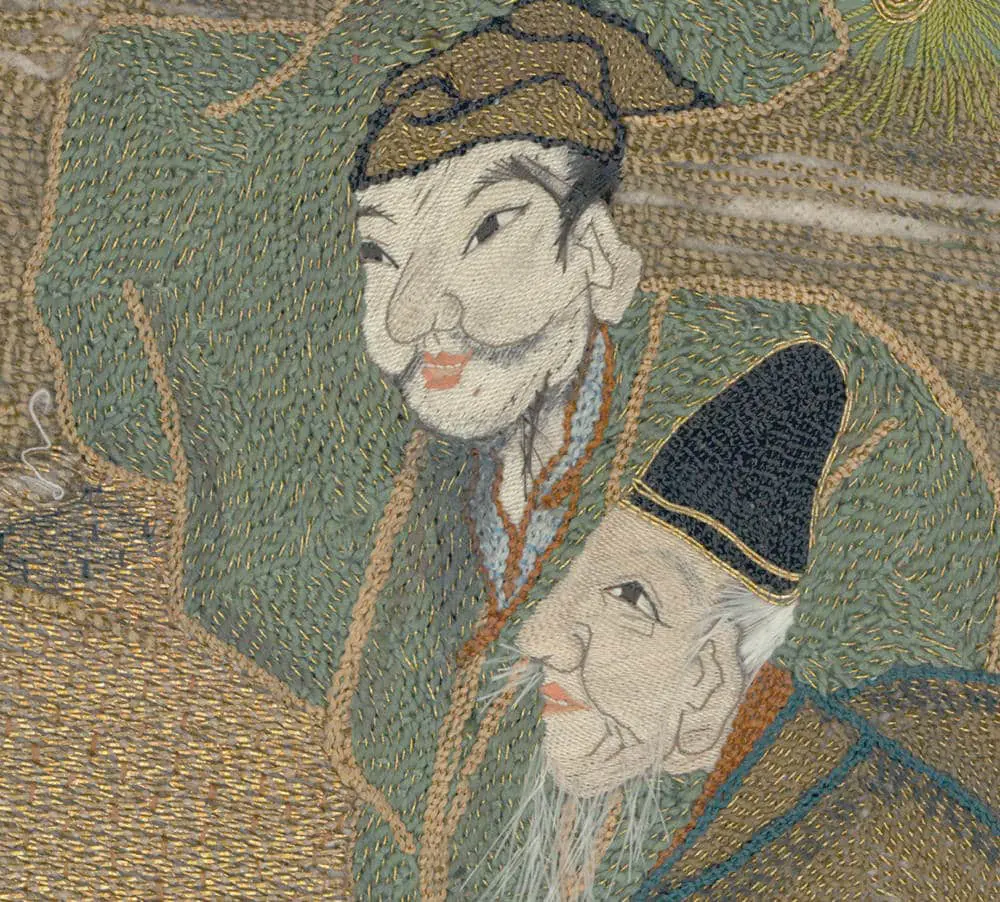 A silk uchishiki showcasing embroidered scholars.