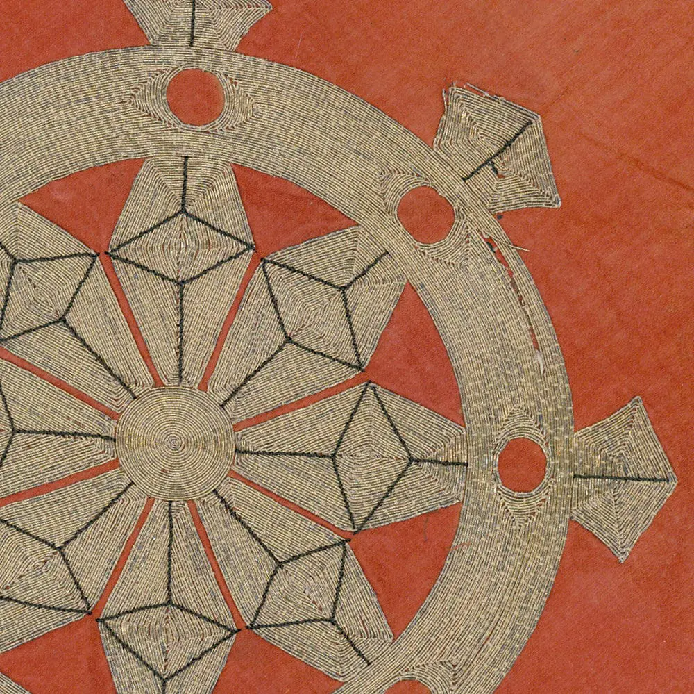 This fine silk uchishiki altar cloth showcases a family crest crafted with meticulous couched metallic embroidery. Measuring 46 inches by 24 inches (117 cm x 61 cm), it remains in good condition, despite bearing several stains.