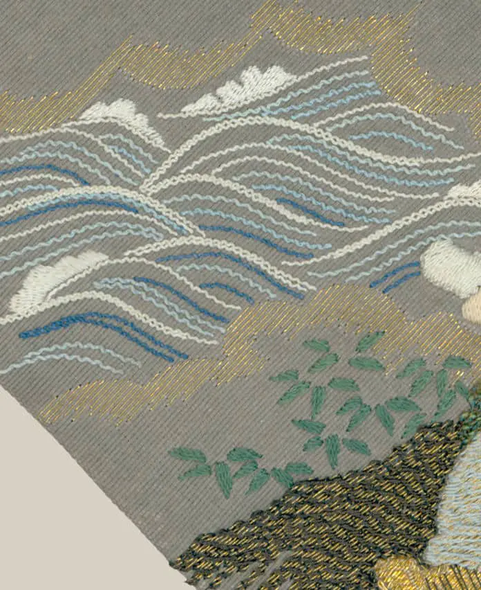 This artwork is featured on pages 84-85 of Ceremonial Textiles of Japan, 18th to 20th Centuries. This book, published by Yorke Antique Textiles, can be previewed or purchased on our website here.