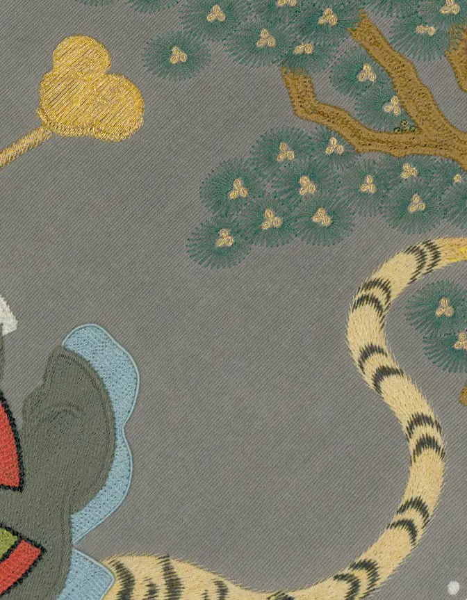 Bukan, a 7th-century Zen Buddhist monk known for his eccentricity, often responded to questions about philosophy or Buddhism with a dismissive "whatever." The tiger, not native to Japan but introduced alongside Buddhism from India and China, symbolizes strength and is believed to have descended to earth from the constellation of the Great Bear in Japanese mythology. Like the phoenix and dragon, it holds a supernatural place, symbolizing the vitality of nature.