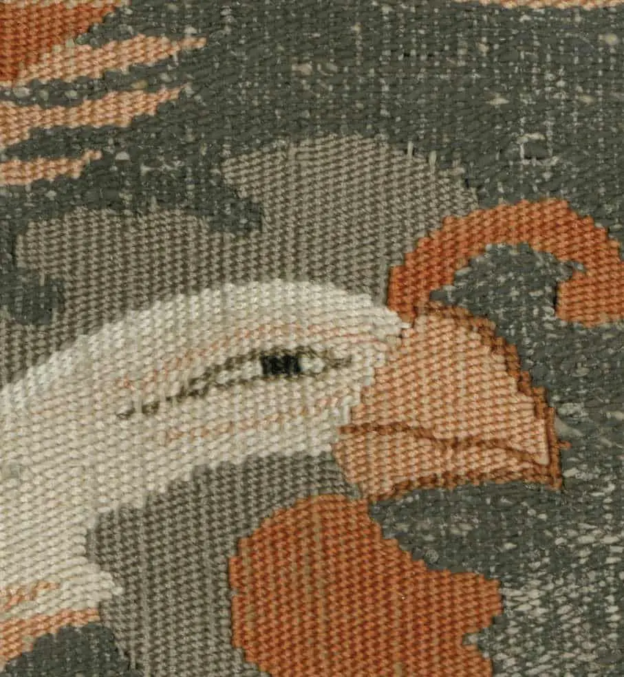 This small silk uchishiki showcases a 'tsume tsuzure' (slit tapestry) weave featuring a phoenix against vivid clouds. Despite being in good condition, there's some fraying present. Measuring 14 inches by 15 inches (36 cm x 38 cm), the phoenix embodies auspicious symbolism, representing qualities such as longevity, resurrection, solar and alchemical fire, as well as symbolizing peace and tranquility.