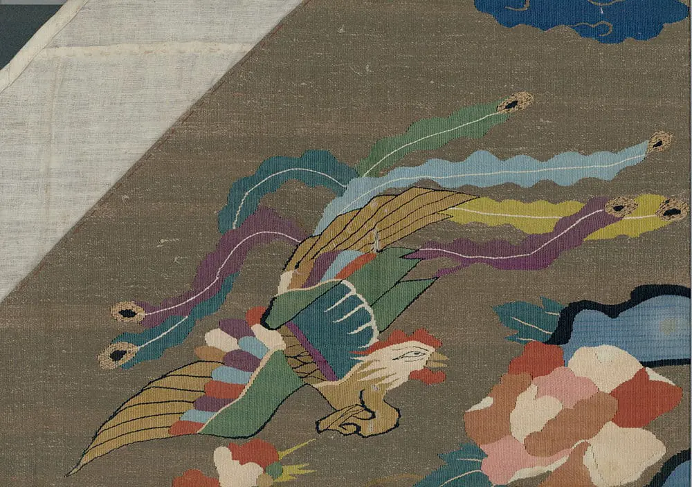 This silk uchishiki, crafted using the tsume tsuzure technique, showcases a phoenix and floral motifs. Its cotton backing supports it well. Though in good condition, there are noticeable wear areas around the center. Measuring 33 inches by 21 inches (84 cm x 53 cm), the phoenix embodies auspicious qualities—longevity, resurrection, solar and alchemical fire—symbolizing peace and tranquility.