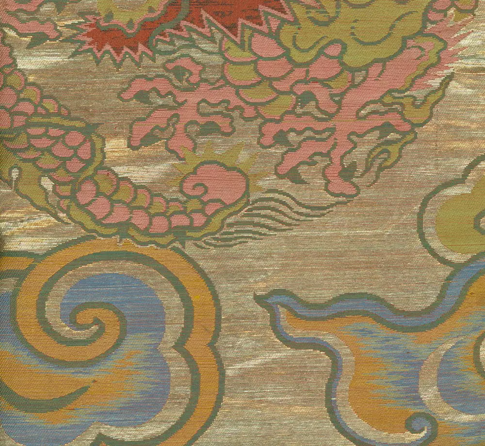 The textile's design features dragons, symbols of power and fortune, brought to Japan from India via China with the advent of Buddhism. Dragons were revered protectors of Buddhist law, a belief reflected in temple structures and names in Japan. This panel likely portrays the 'unryu' or Cloud Dragon, associated with the East, spring, wood element, and the Emperor's power.