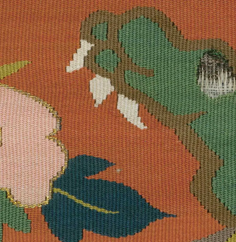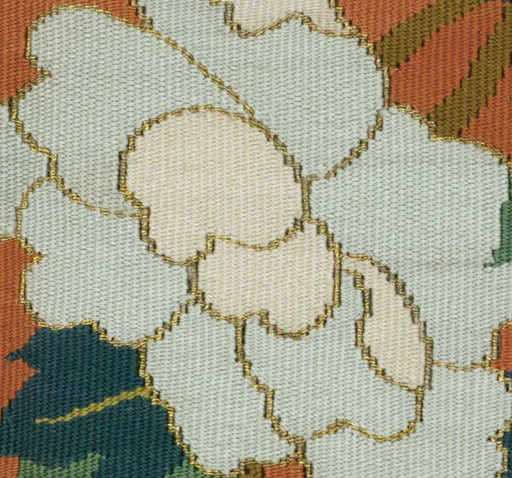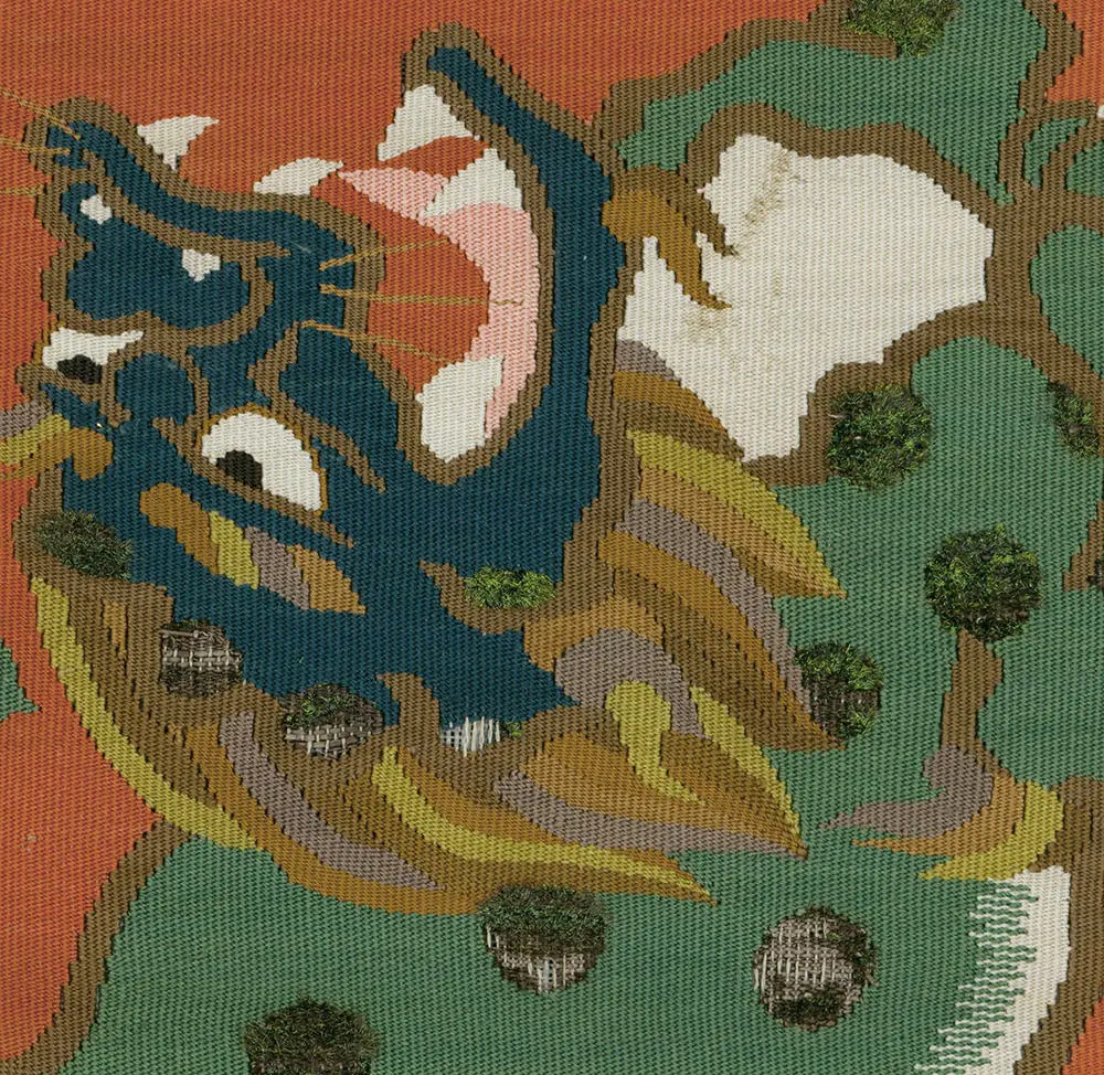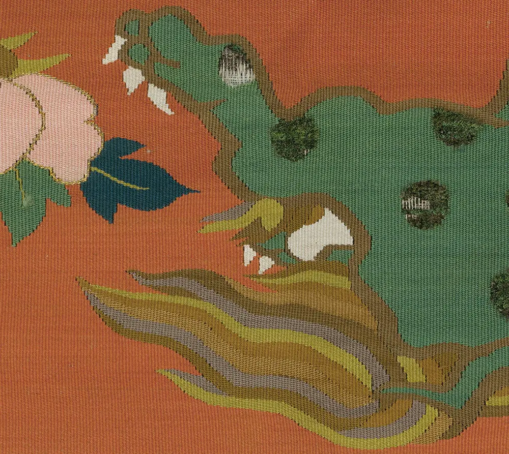 This slit tapestry-weave silk uchishiki showcases depictions of karako (Chinese children) and Karajishi (imaginary lions) amid botan (peonies). The lining is hand-woven "asa" (hemp), and it measures 26 inches by 26 inches along its edges (66 cm x 66 cm). In very good condition, it shows slight deterioration with small brownish spots on the lion.