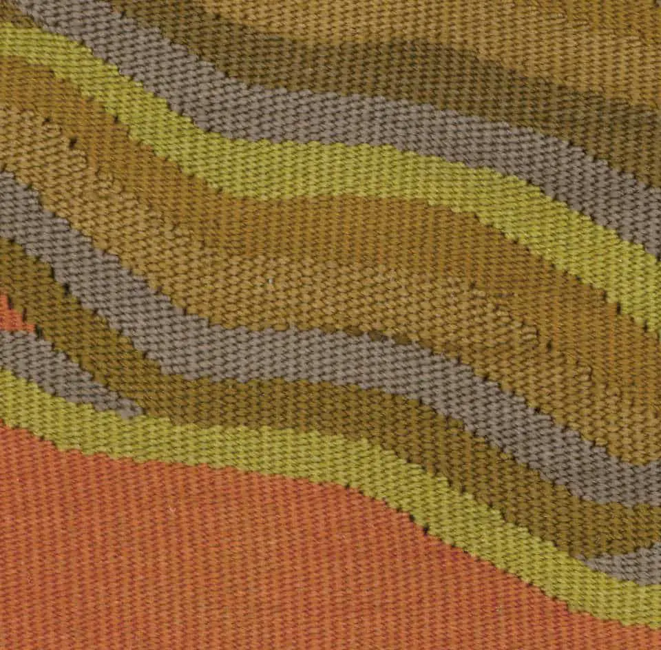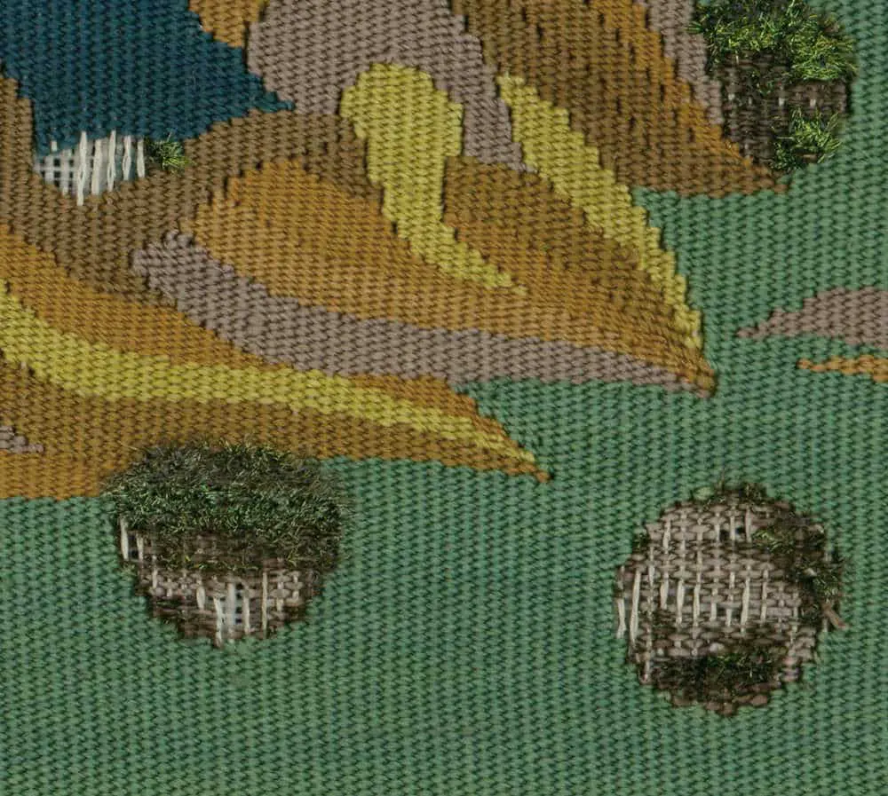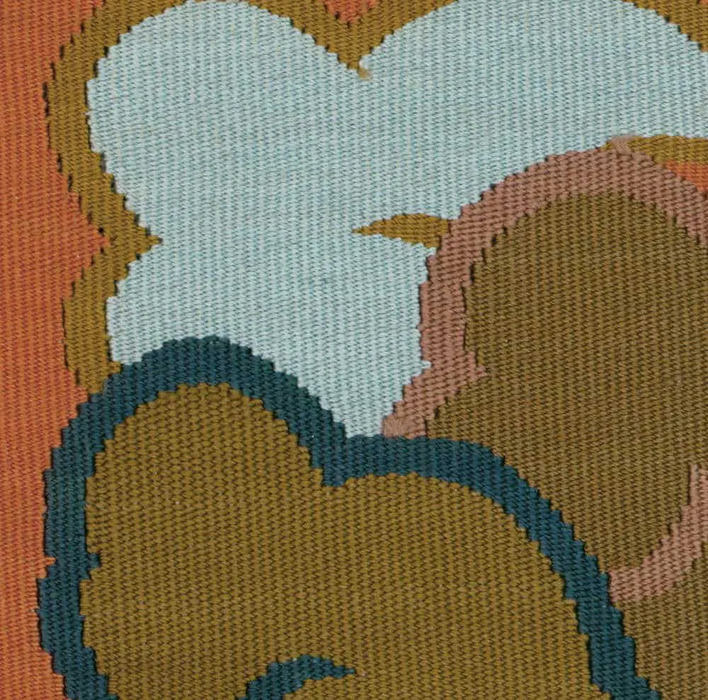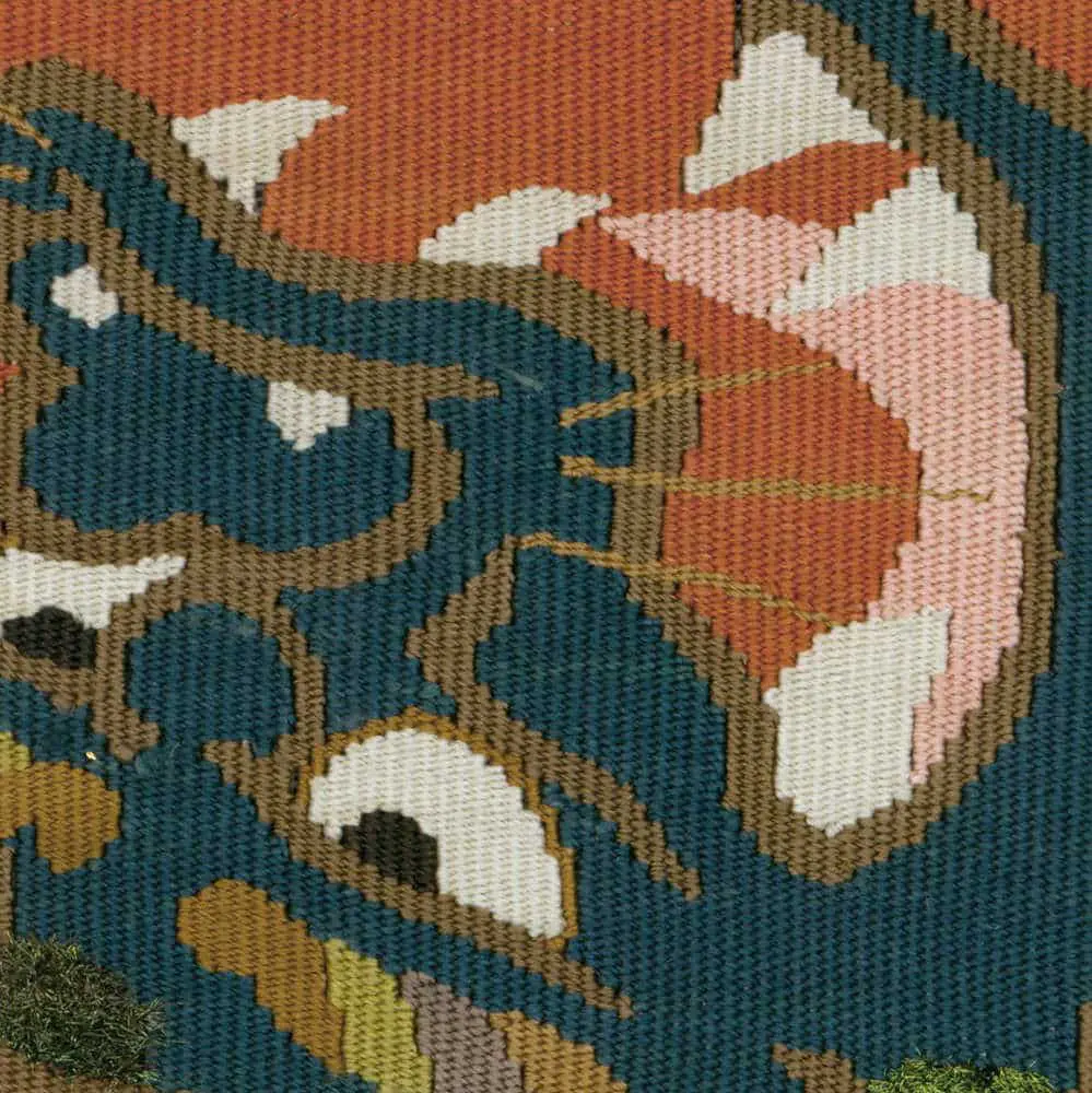 This slit tapestry-weave silk uchishiki showcases depictions of karako (Chinese children) and Karajishi (imaginary lions) amid botan (peonies). The lining is hand-woven "asa" (hemp), and it measures 26 inches by 26 inches along its edges (66 cm x 66 cm). In very good condition, it shows slight deterioration with small brownish spots on the lion.