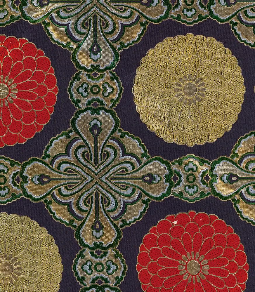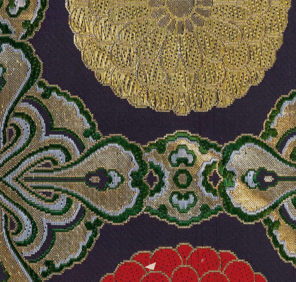 This silk altar cloth was crafted using the brocade technique and remains in very good condition. Its dimensions measure approximately 24 inches by 35 inches, or about 61 centimeters by 89 centimeters.