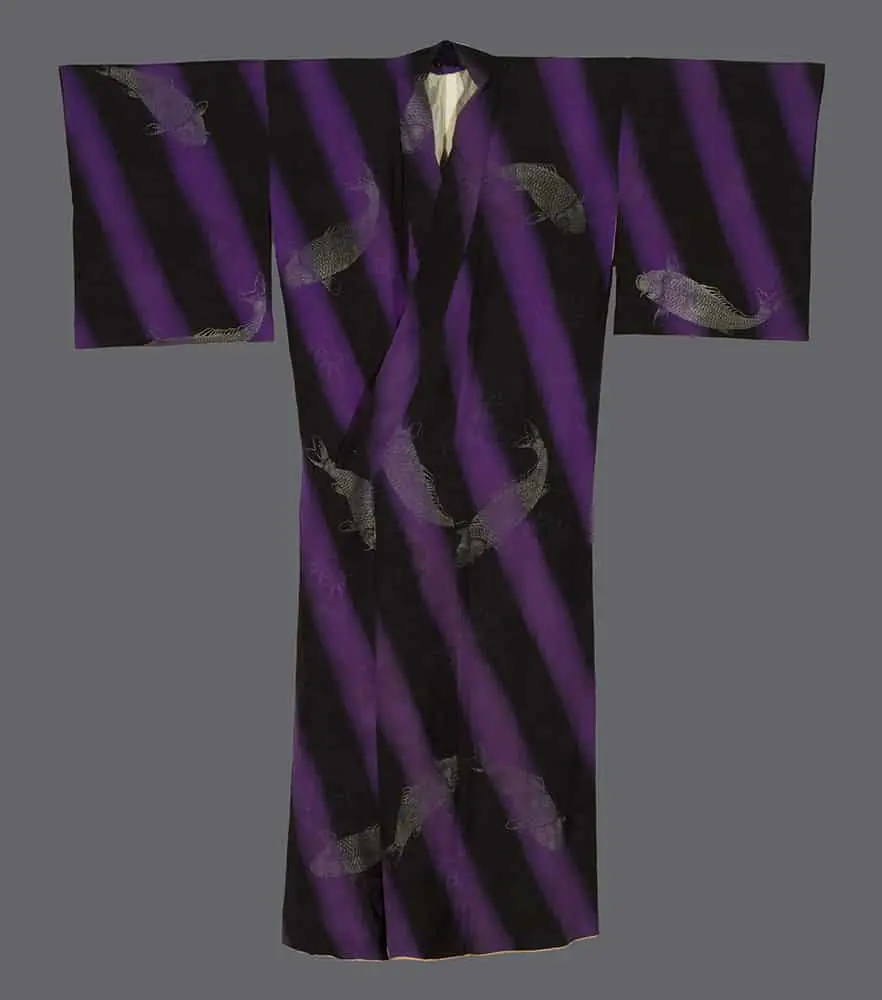 This rinzu silk kimono presents a dramatic diagonal striping in rich purple and deep brown, creating a bold geometric framework that reflects the influence of Art Deco sensibilities, which had permeated Japanese design during the 1920s and continued to resonate through the following decades. This dynamic linear composition represents a departure from the more organic, nature-based patterns of earlier periods, showing how Japanese textile artists embraced modernist principles while maintaining cultural authenticity.