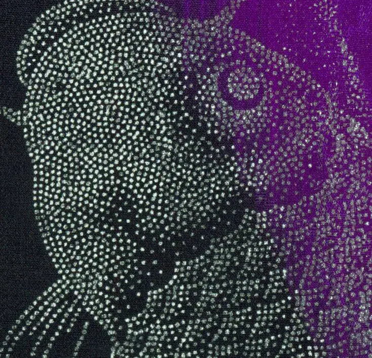 The close-up details reveal the extraordinary precision of the weaving technique, where thousands of tiny metallic threads create a pointillistic effect reminiscent of both traditional Japanese textile arts and contemporary artistic movements like Neo-Impressionism.