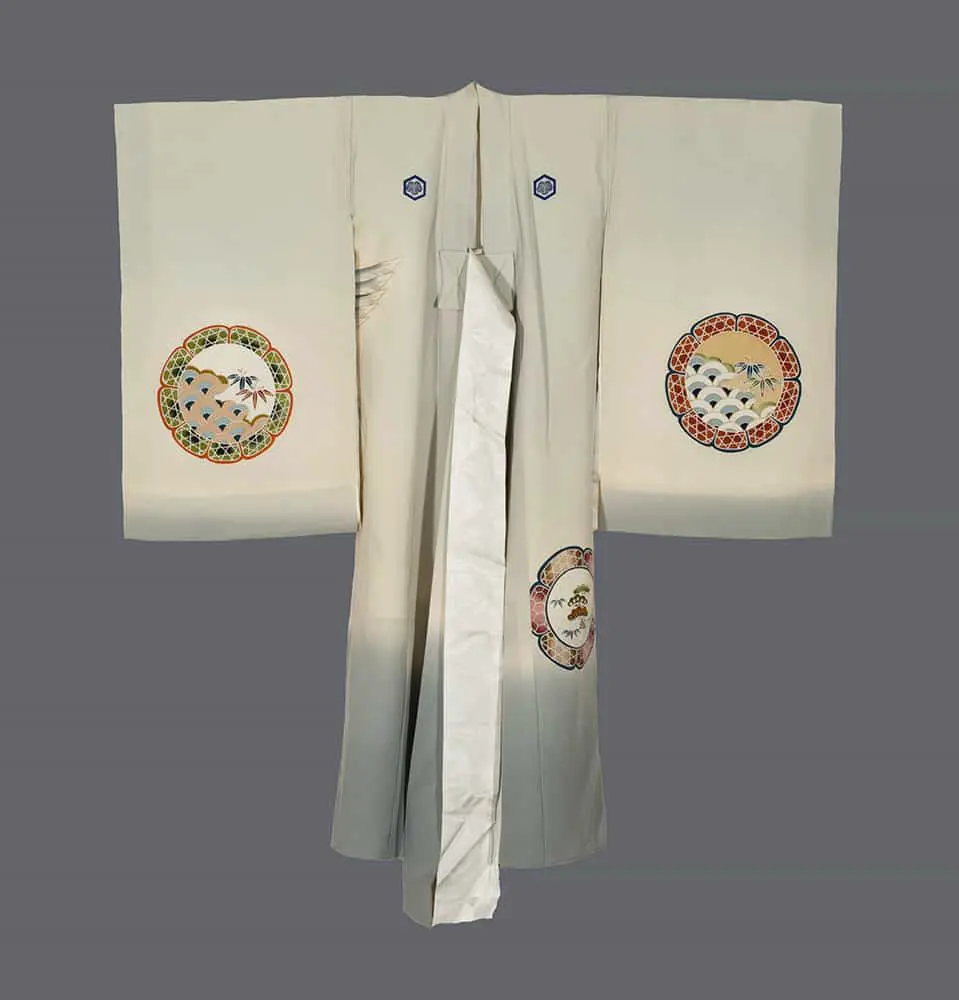 The artistic execution demonstrates the sophisticated combination of multiple traditional Japanese textile techniques working in harmony. The wax-resist dyeing creates crisp, clean color separations, while the yuzen painting allows for the subtle gradations and fine details visible in the bird's plumage and the intricate medallion designs. The metallic couching adds dimensional texture and catches light dramatically, while foil outlining provides sharp definition to key elements. This technical mastery reflects the continuing vitality of traditional Japanese textile arts in the late 20th century, showing how ancient techniques were preserved and refined for contemporary ceremonial use.