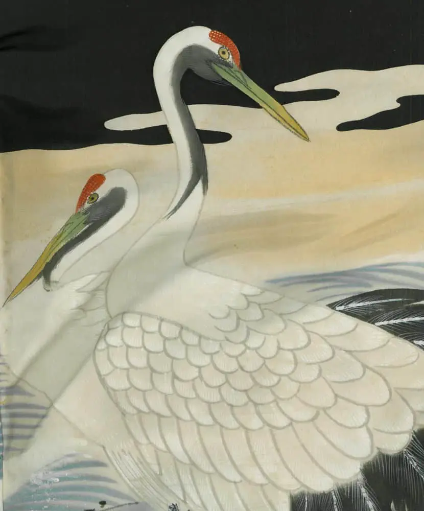 Symbolically, the crane motif is deeply auspicious in Japanese culture, representing longevity, good fortune, and spiritual protection—particularly appropriate for a ceremonial garment intended for a young boy's Shinto blessing. The combination of water, rocks, and cranes evokes the classical theme of "tsuru to nami" (cranes and waves), symbolizing the harmonious relationship between heaven and earth, and the wish for the child to navigate life's challenges with grace and resilience. The flowing water patterns suggest the continuous flow of blessings and prosperity, while the solid rocks represent stability and endurance, creating a sophisticated visual metaphor for the hopes and prayers accompanying this sacred ceremony.