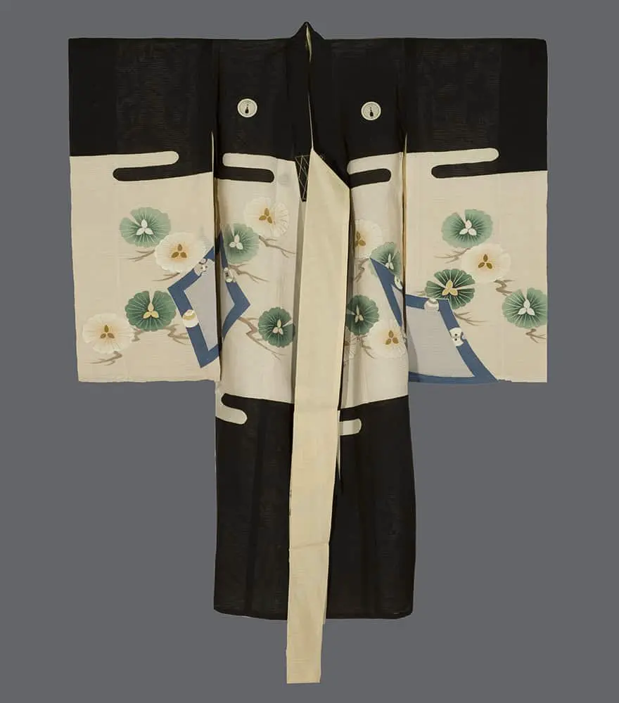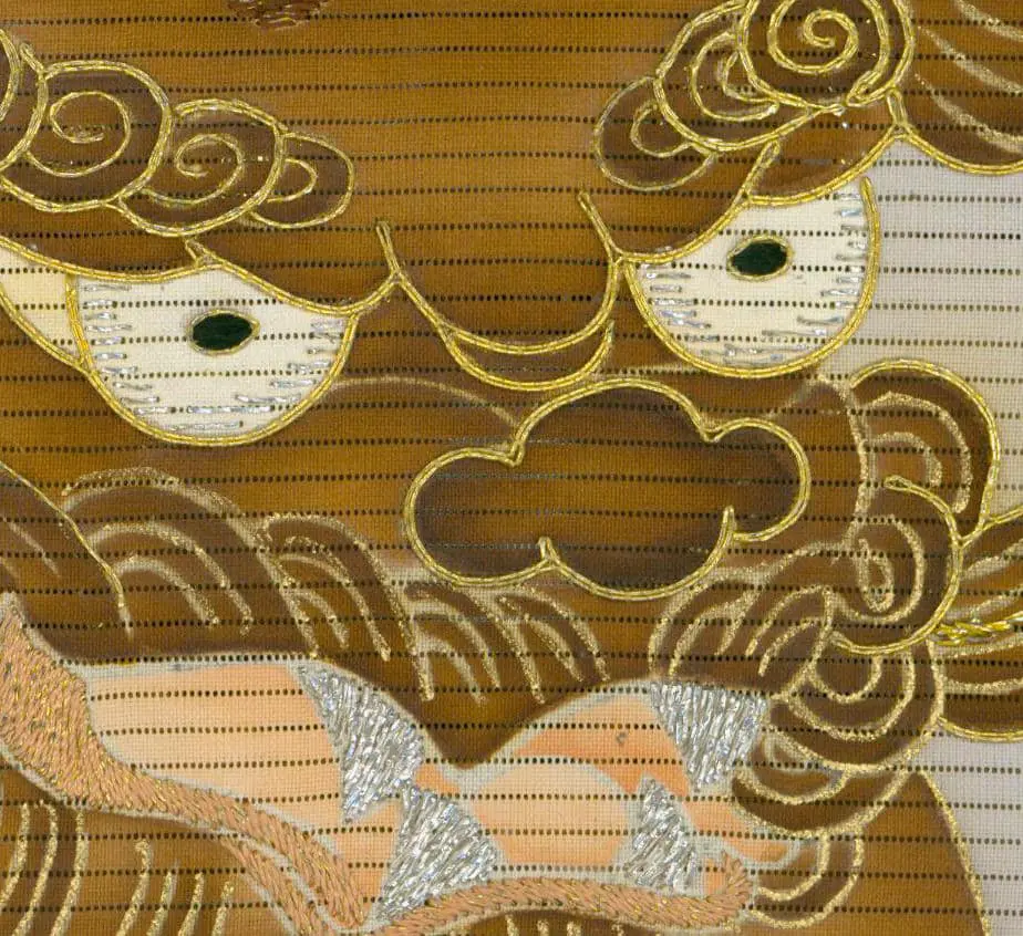 The artistic execution reflects the sophisticated textile traditions of the Showa period, with the ro (gauze) silk base providing a lightweight, ceremonial quality appropriate for shrine blessings. The composition is enhanced by scattered floral elements—stylized chrysanthemums and other auspicious blooms—that are delicately embroidered and positioned to create visual balance across the garment's surface. The detail images reveal the extraordinary technical mastery involved, showing the intricate metallic threadwork, couching techniques, and the interplay of textures created through embossing. Symbolically, the shishi represents protection from evil spirits and is particularly appropriate for a young boy's blessing ceremony, as these guardian creatures are believed to ward off misfortune and ensure the child's spiritual protection.