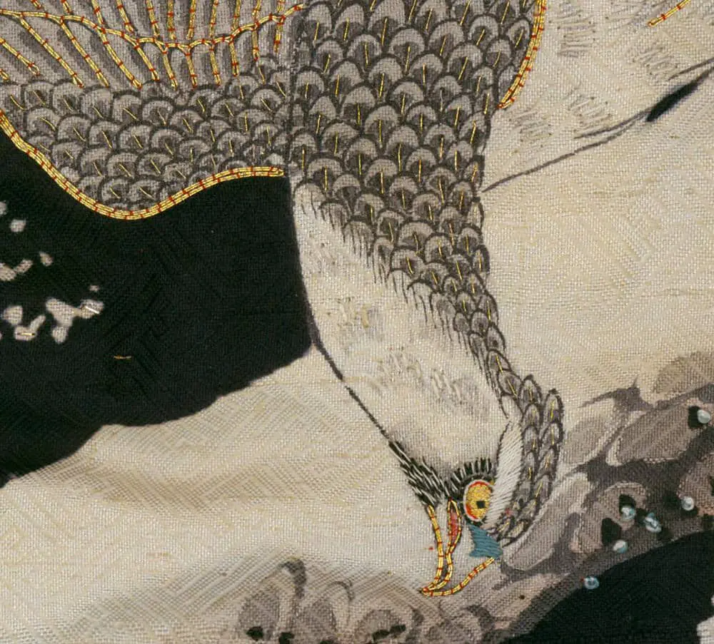 The hawk motif carries profound symbolic weight in Japanese culture, representing strength, courage, and nobility—particularly appropriate for a child's ceremonial garment as it embodies parental hopes for the young wearer's future character and success. The pine tree, an evergreen that withstands winter's harshness, symbolizes longevity, steadfastness, and resilience, while the winter setting itself suggests purity and the promise of renewal. The metallic couching work reveals the extraordinary craftsmanship involved, with gold threads meticulously outlining the hawk's feathers and defining architectural elements of the composition. This technique demonstrates the influence of both Buddhist textile traditions and the period's increasing incorporation of Western decorative techniques, creating a synthesis that defined Meiji era luxury goods. The overall aesthetic recalls the refined naturalism of the Kano school of painting, where natural subjects were rendered with both observational accuracy and symbolic depth, transformed here into a wearable work of art that would have marked significant ceremonial occasions in a child's life.