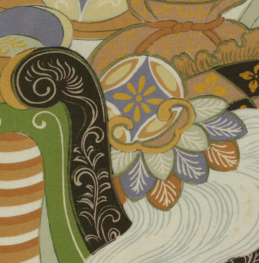 This plain silk miyamairi kimono showcases treasure-ship artwork with hand-painted highlights. Despite minor imperfections, it's in very good condition. Its measurements are approximately 34 inches from sleeve-end to sleeve-end and 40 inches in height, or about 86 centimeters by 102 centimeters.