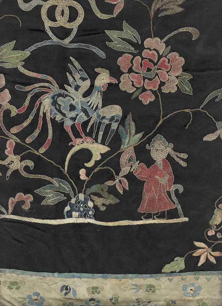 This piece features very fine embroidery on silk, with a satin stitch border and the main center adorned with seed stitch (also known as "forbidden stitch") and silk floss. It's backed by hand-made linen, contributing to its quality. Measuring 17 inches by 17 inches (43 cm x 43 cm), the piece is in very good condition, although there is some overall soiling that suggests it could benefit from professional cleaning to restore its pristine appearance.