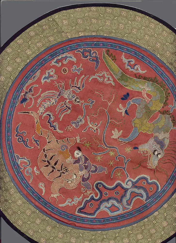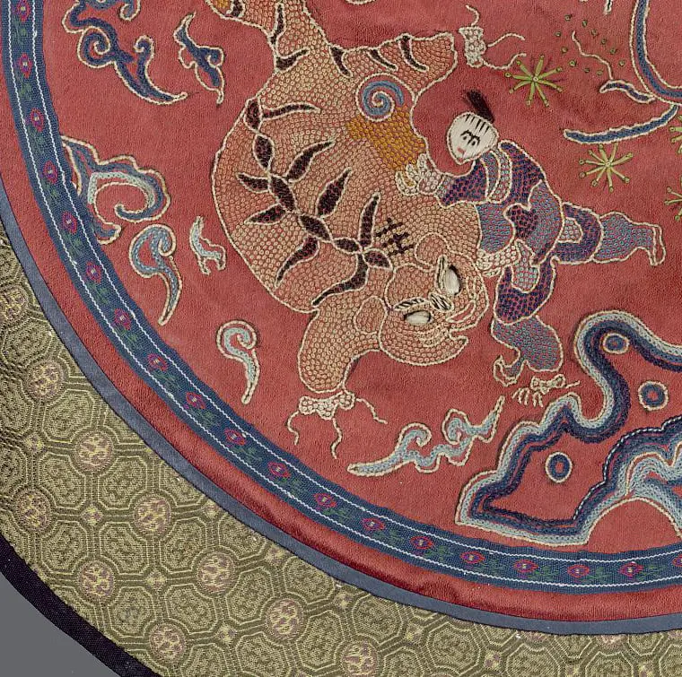A panel featuring a combination of brocade, satin stitch, seed stitch (referred to as "Peking" or "forbidden" stitch), and applique work. The meticulous seed stitching resembles the fine craftsmanship seen in 18th and 19th-century pieces. Despite its excellence, there are only two tiny stains marring its otherwise pristine condition. The panel measures 14 inches x 14 inches (36 cm x 36 cm).