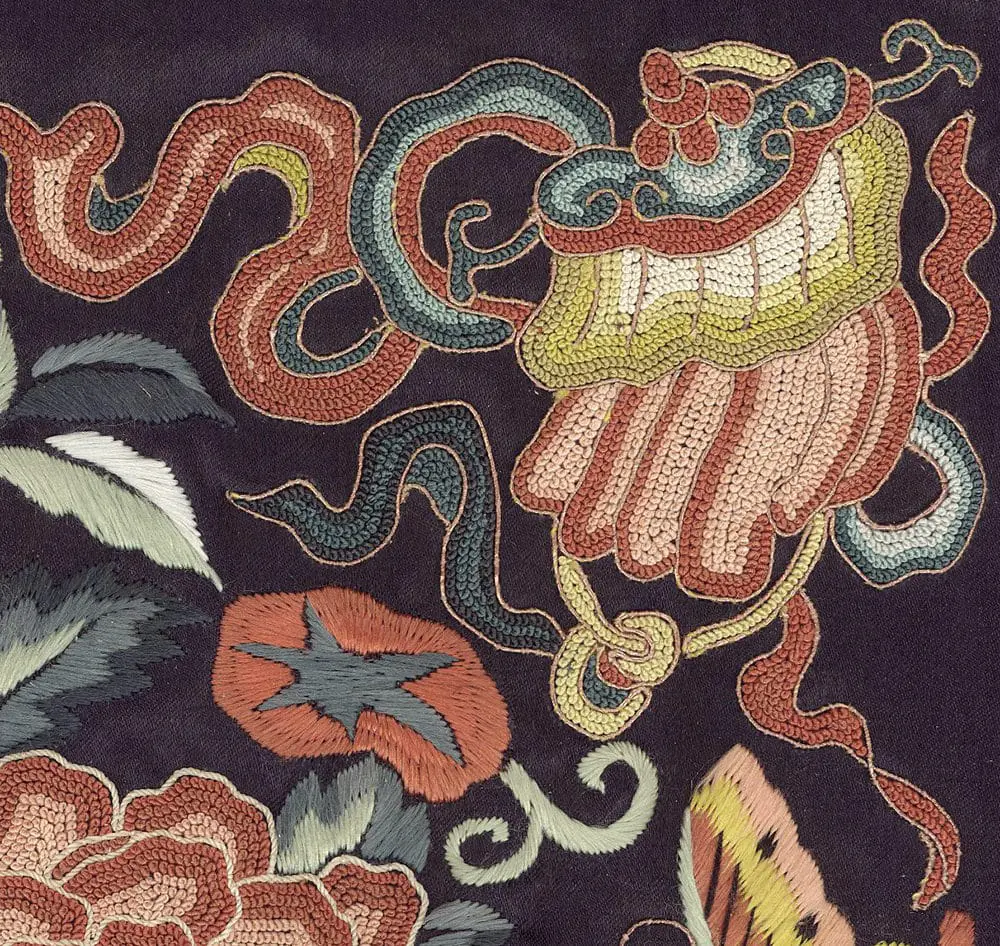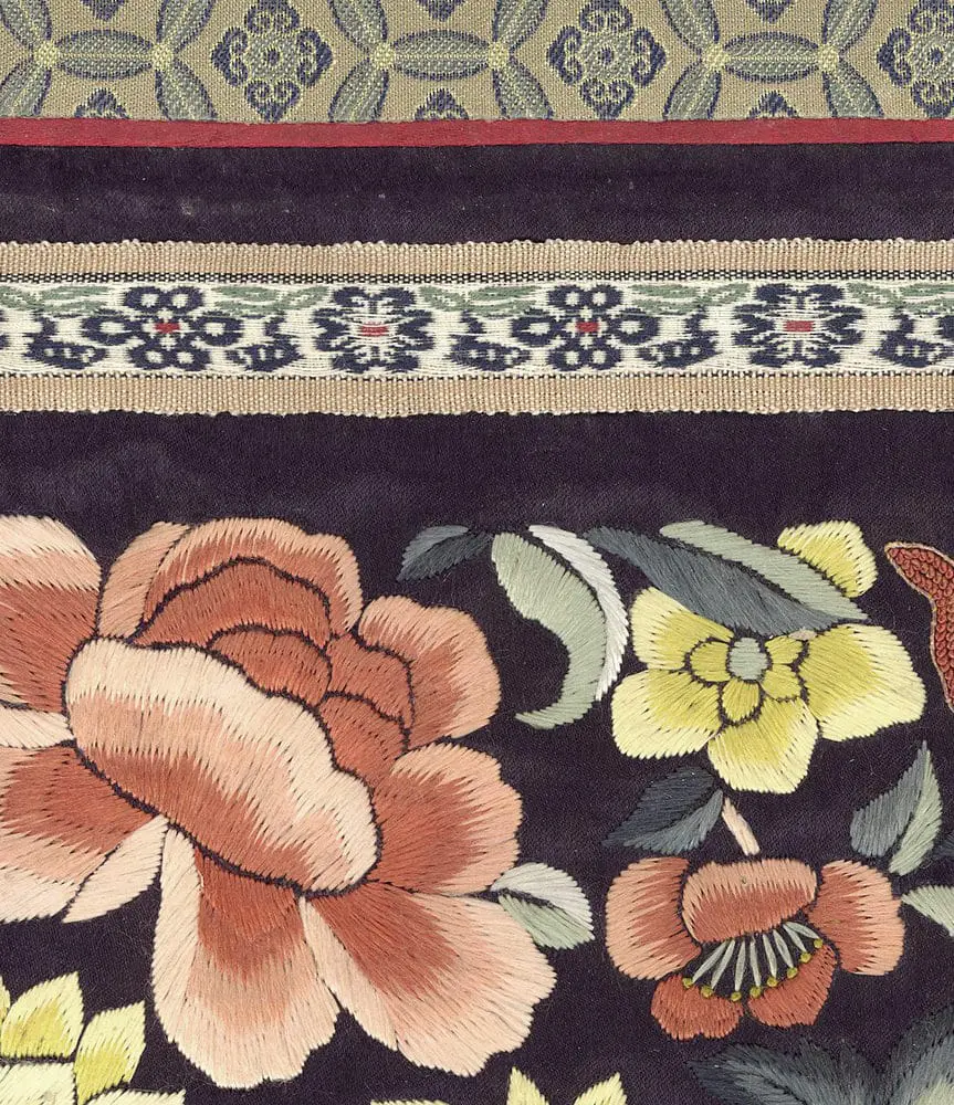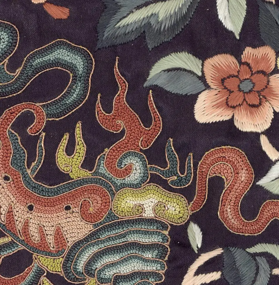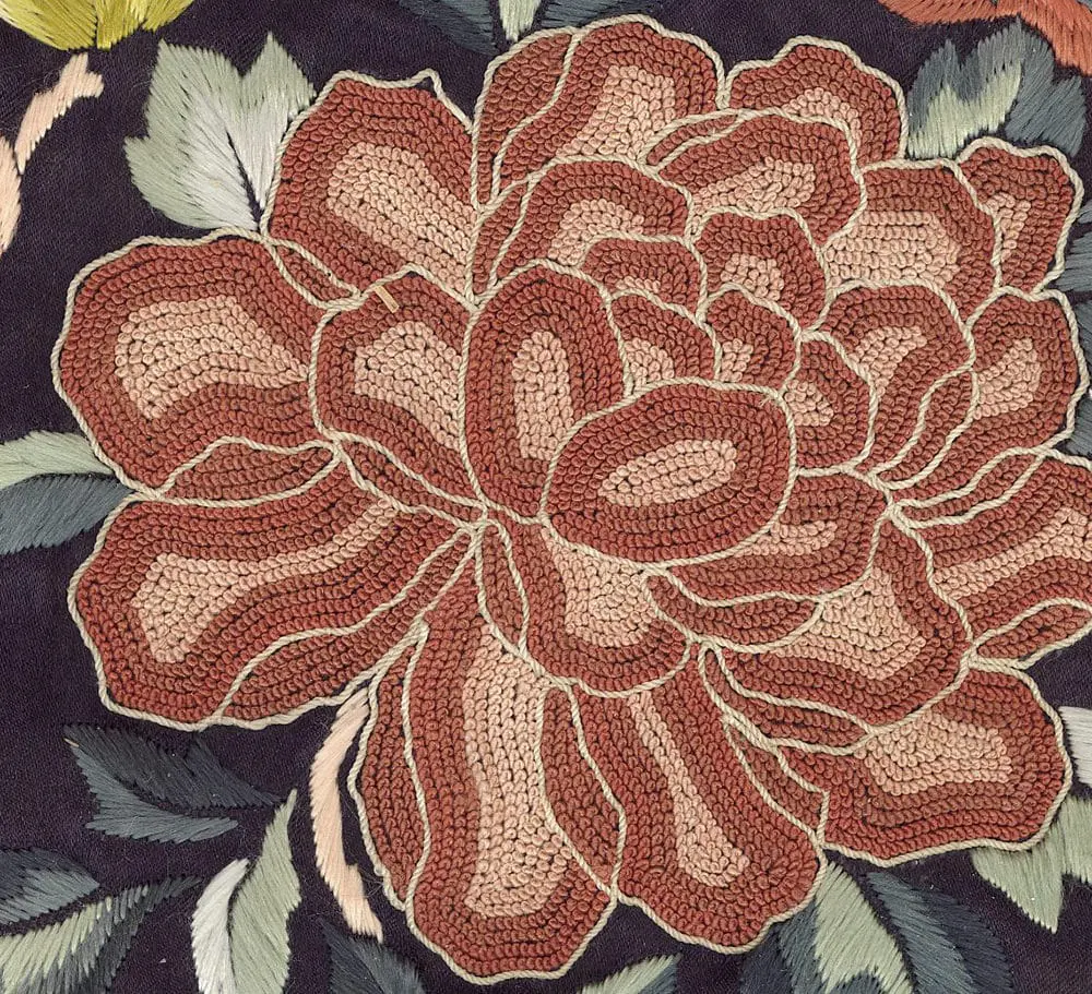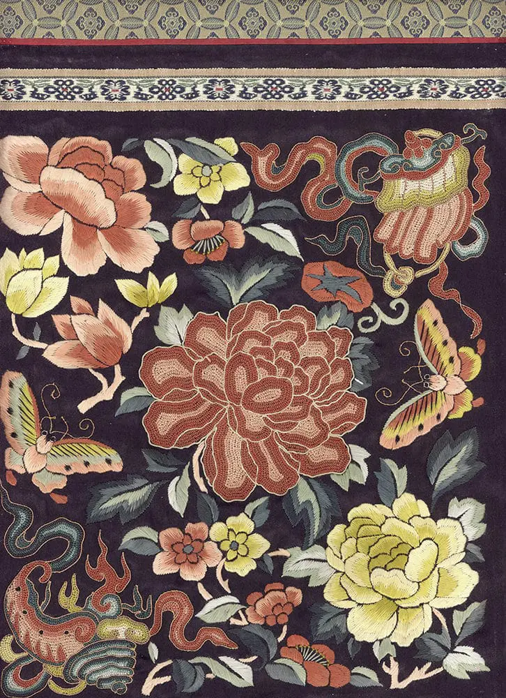 This piece features fine embroidery on a silk background, with the backing cloth also made of fine silk. It's in excellent condition and measures 16 inches by 15 inches (41 cm x 38 cm).