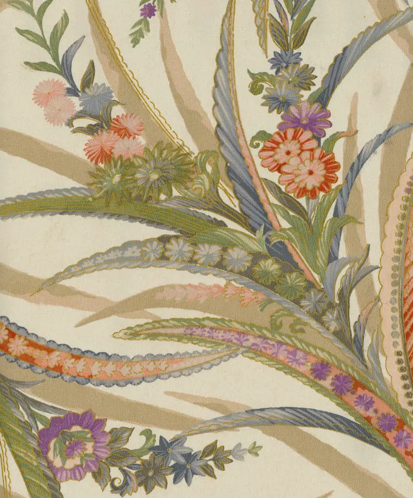 This chirimen silk kimono showcases silk-screen plant motifs. It measures 49 inches (124 cm) from sleeve-end to sleeve-end and stands 61 inches (155 cm) in height. However, it's worth noting that it's in good condition but has a number of light stains on the cream-colored background, which might make it unsuitable for wear.
