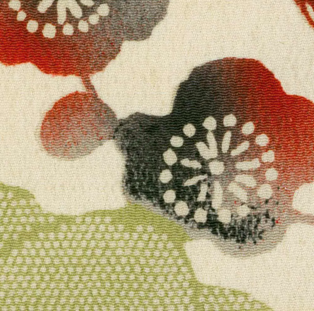 The flowing, interconnected composition recalls both Art Nouveau's organic linearity and the emerging Pop Art movement's bold graphic approach, while maintaining distinctly Japanese characteristics in its asymmetrical balance and seasonal symbolism. The sophisticated color palette of muted earth tones punctuated by vibrant coral and burgundy accents reflects the period's movement toward more nuanced color relationships, moving beyond the stark contrasts of earlier decades toward a more complex visual harmony that would influence Japanese textile design for generations.