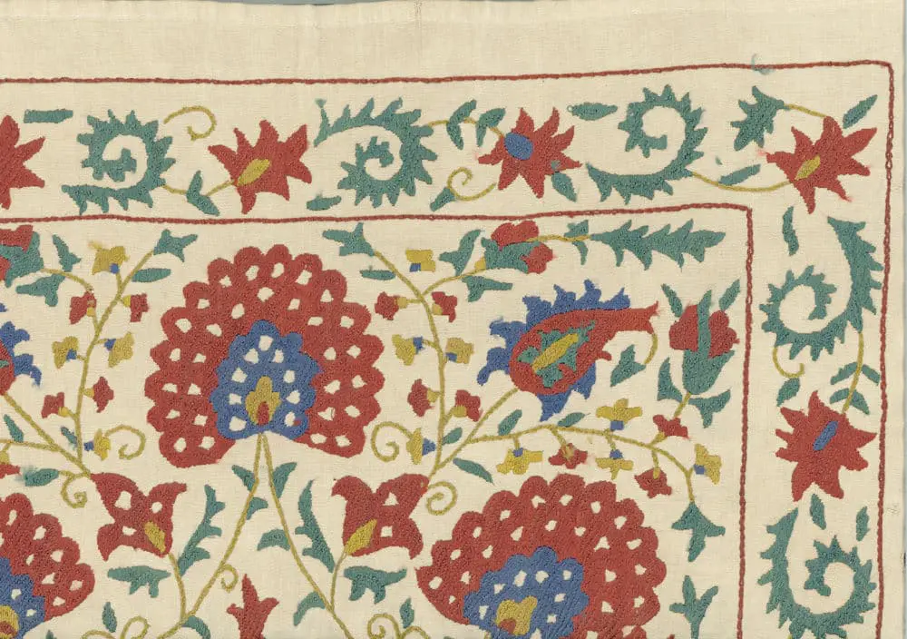This handcrafted silk embroidery on cotton depicts flowering shrubs using natural dye colors such as indigo, madder, walnut skins, and barberries (for browns/black), pomegranate skin and turmeric (for yellows), sumac (for maroon), and various combinations of these. It's in excellent condition, measuring 50 inches by 25 inches (127 cm x 64 cm).