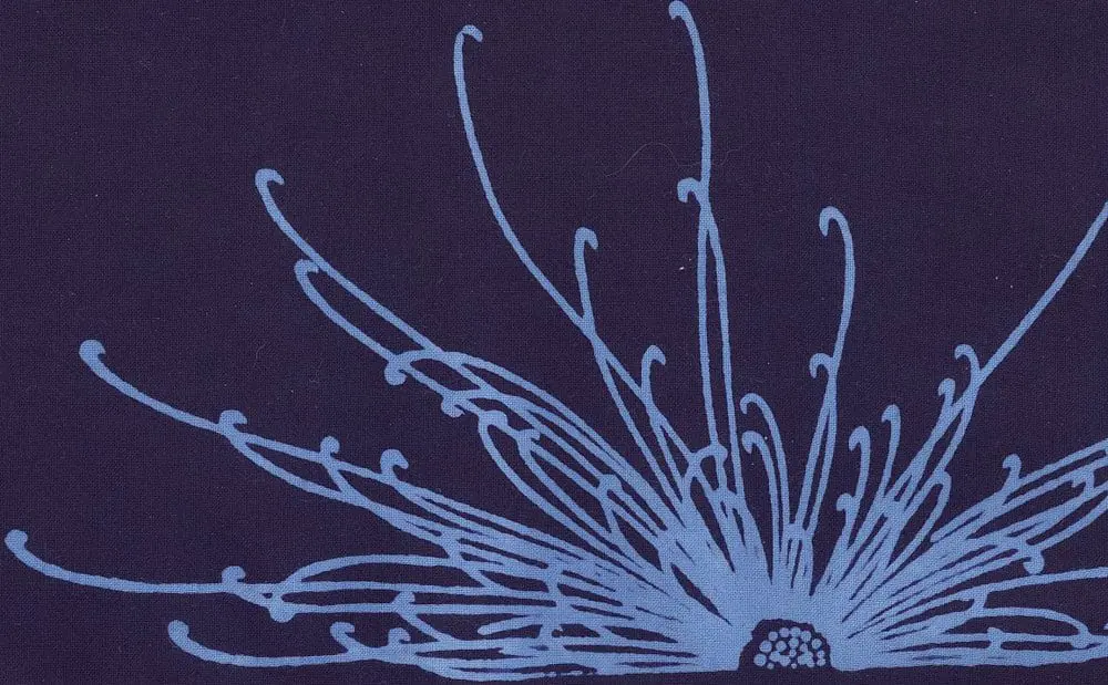 This panel, extracted from a vintage Cotton Yukata Kimono sample book, features a deep indigo blue adorned with Spider Chrysanthemums in powder blue. Japanese characters in white grace the lower end of the panel. Crafted from a thin, crisp cotton, it remains in excellent condition despite a few pinholes at the top end, which were used for threading it into the sample book, and a small paper numbered label. It measures 14 inches x 24 inches (36 cm x 61 cm).