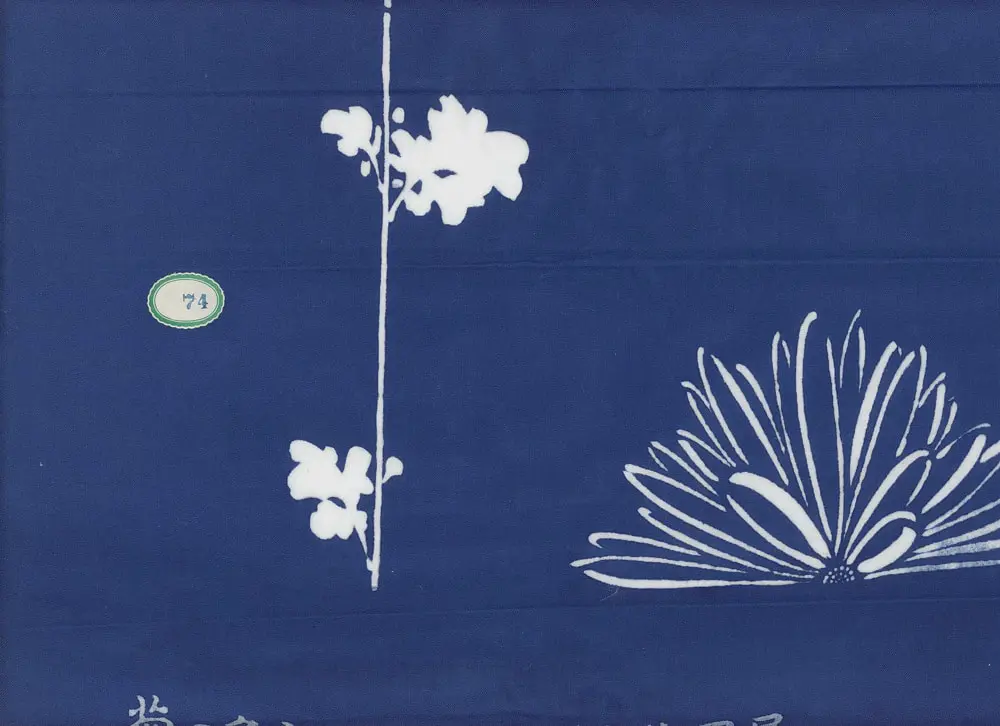 This panel, extracted from a vintage Cotton Yukata Kimono sample book, features a deep indigo blue adorned with Spider Chrysanthemums in powder blue. Japanese characters in white grace the lower end of the panel. Crafted from a thin, crisp cotton, it remains in excellent condition despite a few pinholes at the top end, which were used for threading it into the sample book, and a small paper numbered label. It measures 14 inches x 24 inches (36 cm x 61 cm).