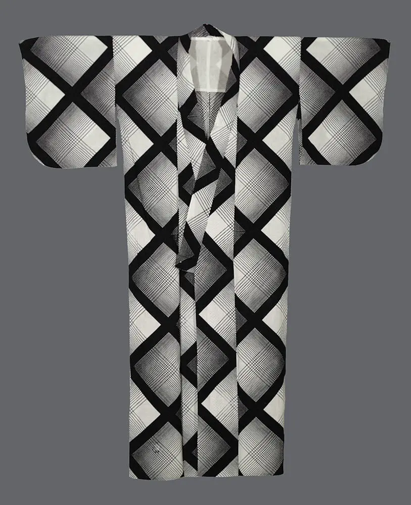 This striking 1970s yukata exemplifies the bold aesthetic experimentation that characterized Japanese textile design during this transformative decade. The garment features a dynamic geometric pattern that breaks dramatically from traditional yukata motifs, embracing instead a modernist vocabulary of intersecting diamonds and linear elements rendered in stark black and white. This monochromatic palette and geometric approach reflects the influence of international design movements, particularly Op Art and Bauhaus-inspired modernism, which were gaining traction in Japanese applied arts during this period.