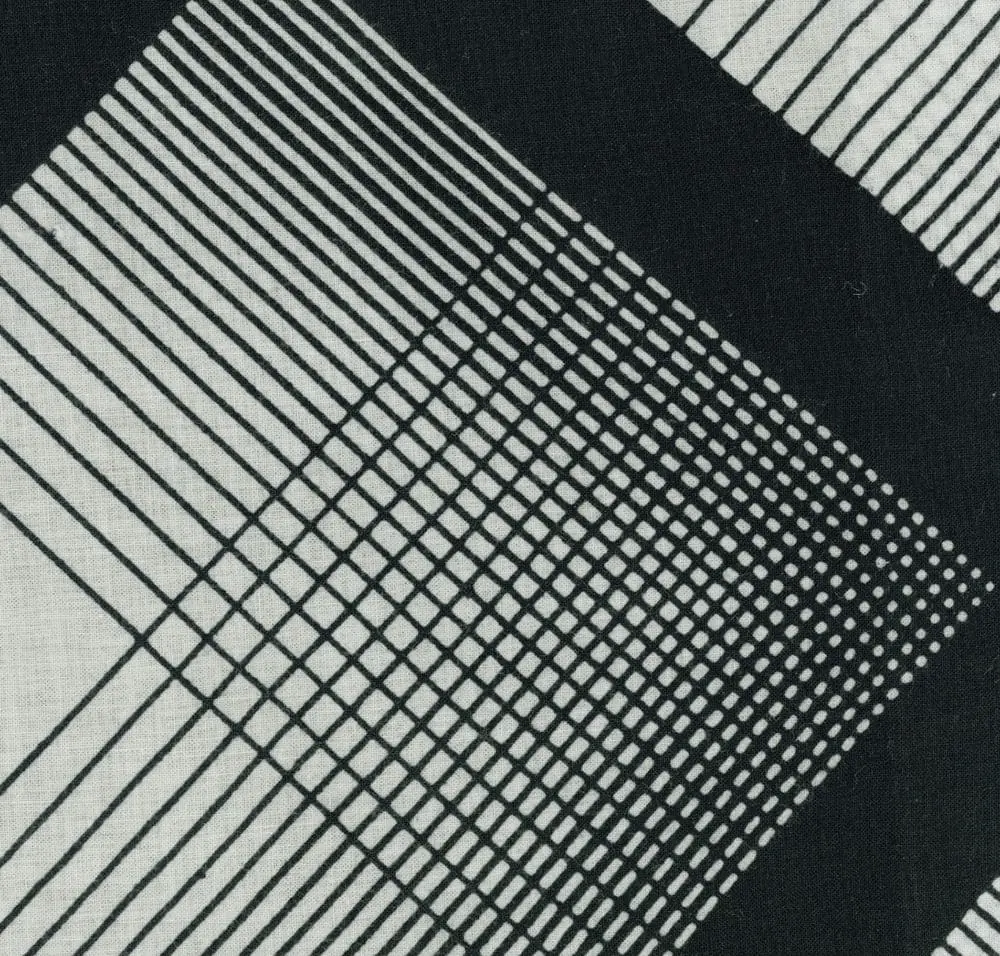 The detail images reveal the pattern's technical complexity, showing how fine parallel lines transition into a grid system that creates optical effects reminiscent of halftone printing or digital pixelation - remarkably prescient given the era's pre-digital context. The hand-sewn construction maintains connection to traditional craftsmanship while the silkscreen printing technique represents the period's embrace of industrial reproduction methods.