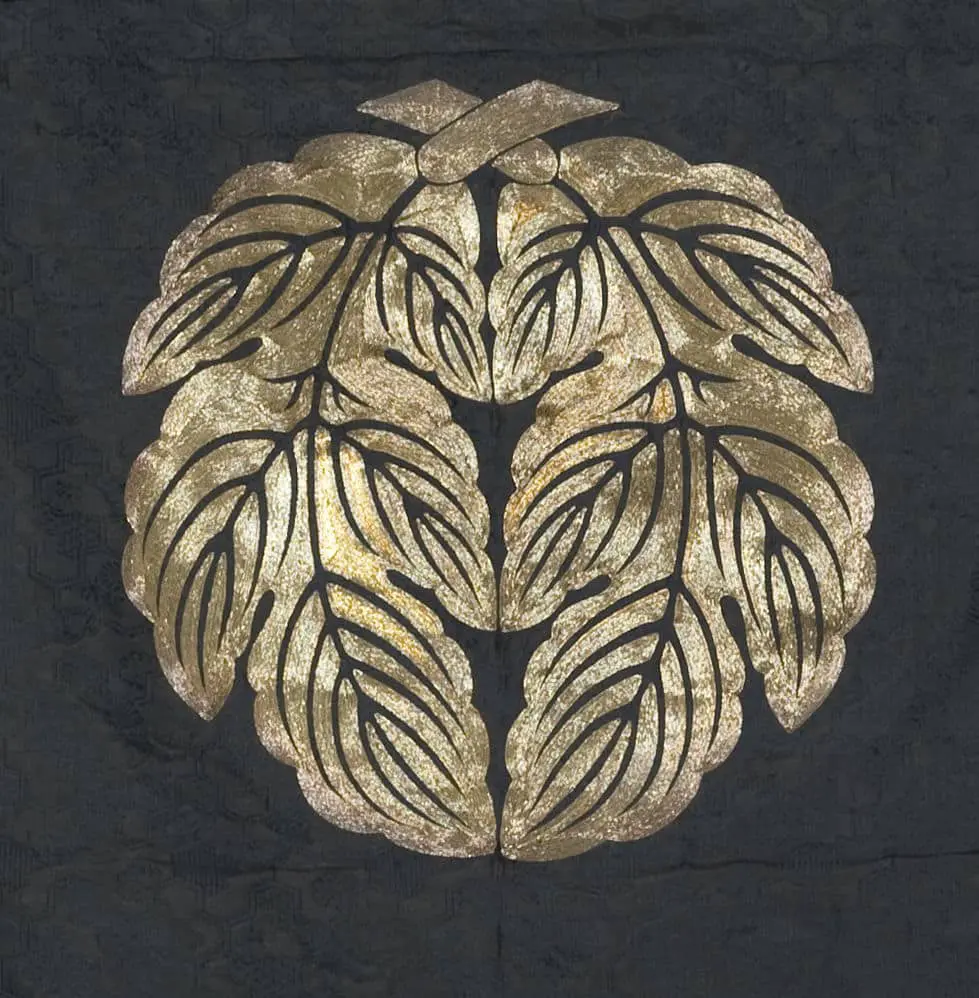 This silk gift cloth showcases a refined two-tone metallic thread couching technique, forming an elaborate central family crest set against a single-color brocade background. With unusually refined tassels and excellent condition, this piece measures 25 inches by 29 inches (64 cm x 74 cm). The central crest features a pair of chrysanthemum leaves, a motif widely adopted as a family emblem in Japan due to its auspicious and beautiful nature. The chrysanthemum's resemblance to the sun earned it alternative names such as 'sun splendor' and 'sun spirit', and it's also been associated symbolically with longevity.