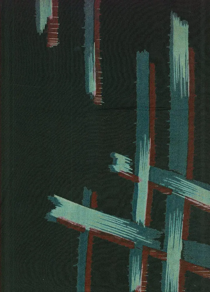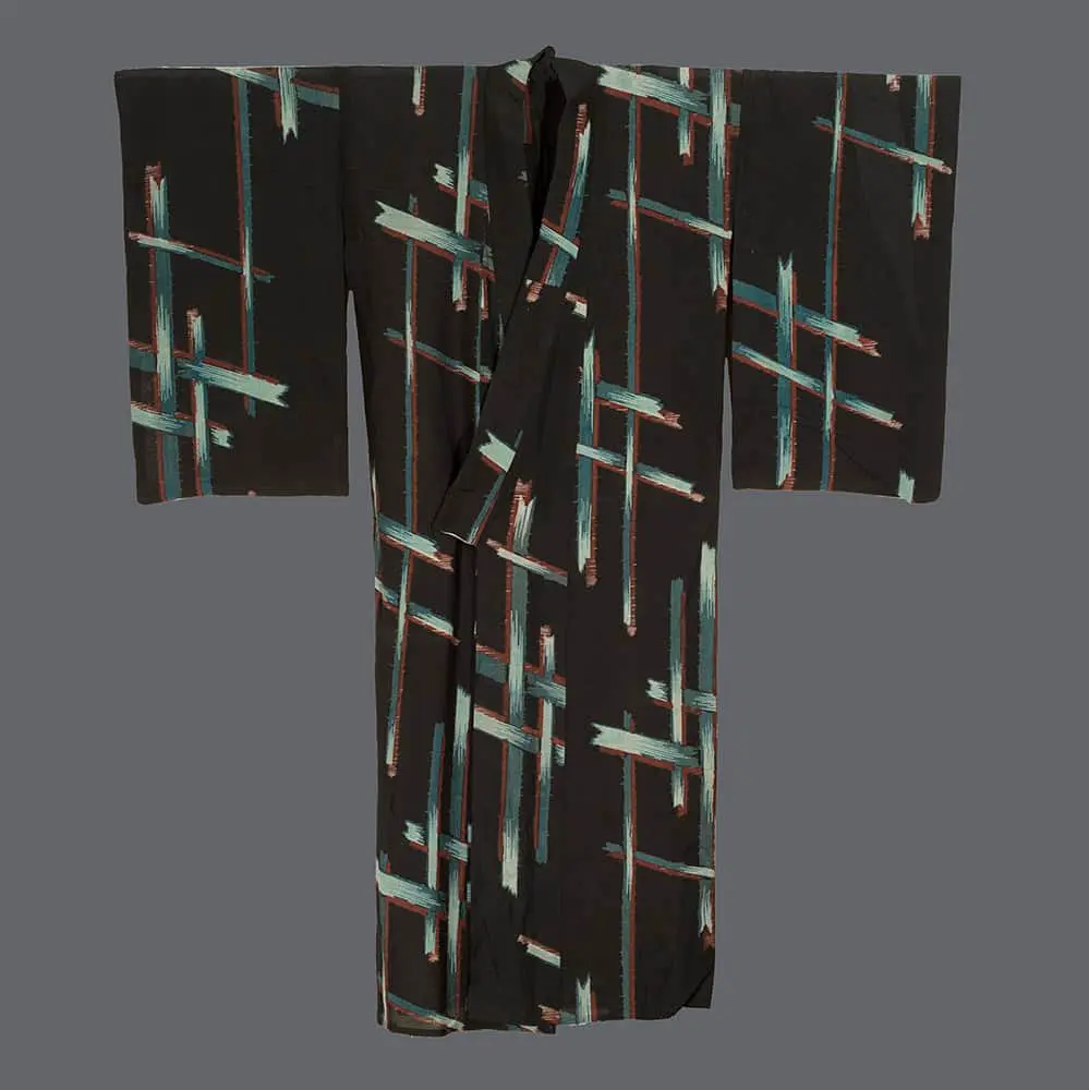 The kimono features a striking cross-hatch woven across a black ground. The motifs appear to be created through complex supplementary weft techniques, with what looks like turquoise-green and coral-red threads forming geometric intersecting patterns that scatter dynamically across the fabric surface. The design has an almost abstract, painterly quality that reflects the period's growing interest in non-representational art and geometric modernism.