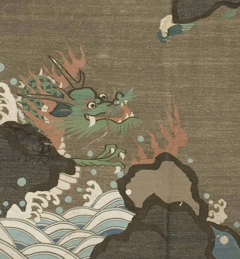 This slit tapestry uchishiki, dated back to 1832 as indicated by the kanji characters on the backside, is in fair condition. However, there are several damaged areas in the silk, potentially due to the mordants used. It measures 25 inches by 25 inches (64 cm x 64 cm). The dragon in Japan holds significant symbolism, serving as the protector of Buddhist law, a representation of imperial power, guardian of the eastern direction, controller of rain and storms, bestower of wealth and fortune, and possessing the magical ability to change shapes.