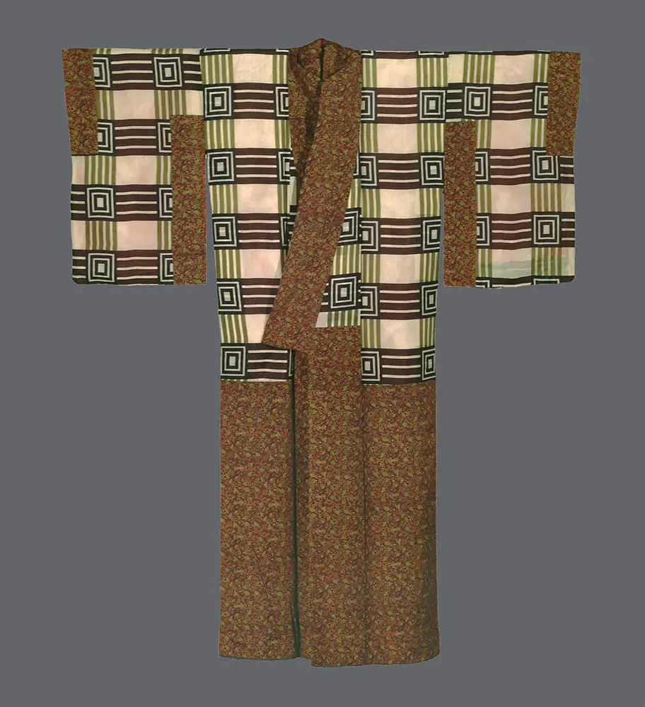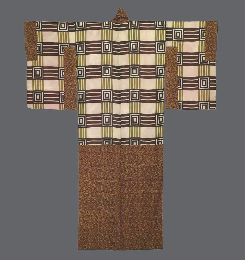 The upper portion of the garment features a dramatic checkerboard pattern executed in chocolate brown, olive green, and cream tones, with each square containing either bold geometric motifs - concentric squares and parallel stripes - or remaining as solid color blocks. This systematic geometric arrangement reflects early twentieth-century international design trends, particularly the influence of Art Nouveau's geometric phase and nascent Art Deco sensibilities that were beginning to permeate Japanese decorative arts. The crisp definition and rhythmic repetition of these patterns suggest influence from Western textile design principles while maintaining the technical excellence of traditional Japanese silk weaving.