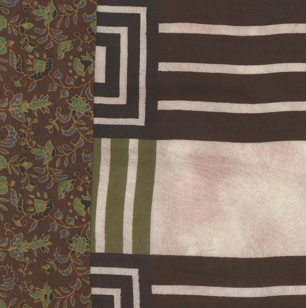The lower section transitions to a rich golden-brown ground decorated with an intricate small-scale pattern, creating textural depth and visual interest. This bipartite design strategy - combining bold geometric elements with more traditional pattern work - exemplifies the experimental spirit of Meiji and early Taisho period textile design, where artisans freely explored new aesthetic possibilities while respecting established technical traditions. The sophisticated color palette of earth tones unified by the golden-brown base demonstrates refined taste that would complement rather than compete with the outer kimono, fulfilling the dounuki's essential role as elegant foundation garment while asserting its own distinctive artistic character.