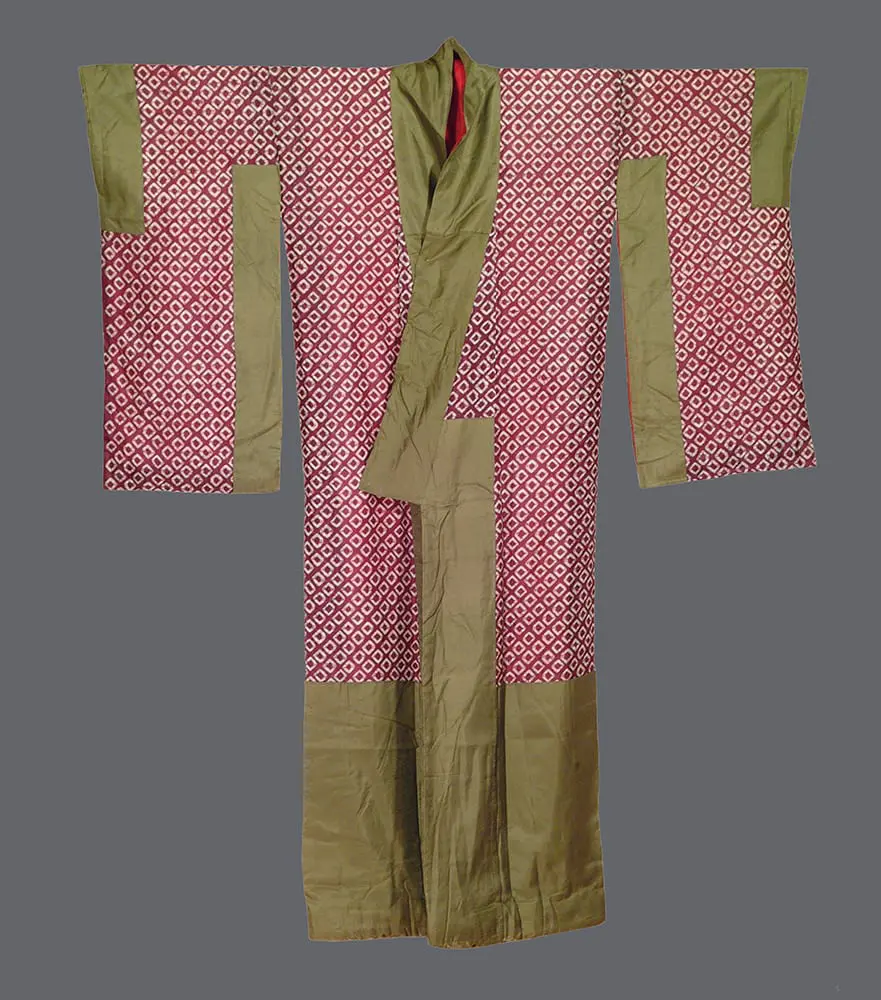 This dounuki silk inner kimono exemplifies the sophisticated layering techniques that characterized formal Japanese dress, featuring a striking geometric shibori-dyed pattern that demonstrates the marriage of traditional resist-dyeing methods with bold, modernizing design sensibilities. The upper portion displays a precise diamond lattice pattern (shippo-tsunagi) executed in deep red and white through shibori techniques, creating a rhythmic visual texture that reflects both classical Japanese geometric traditions and the period's growing engagement with systematic, repeating patterns that would later influence international design movements.
