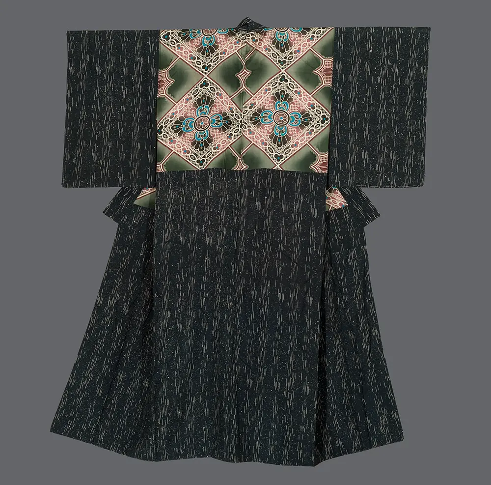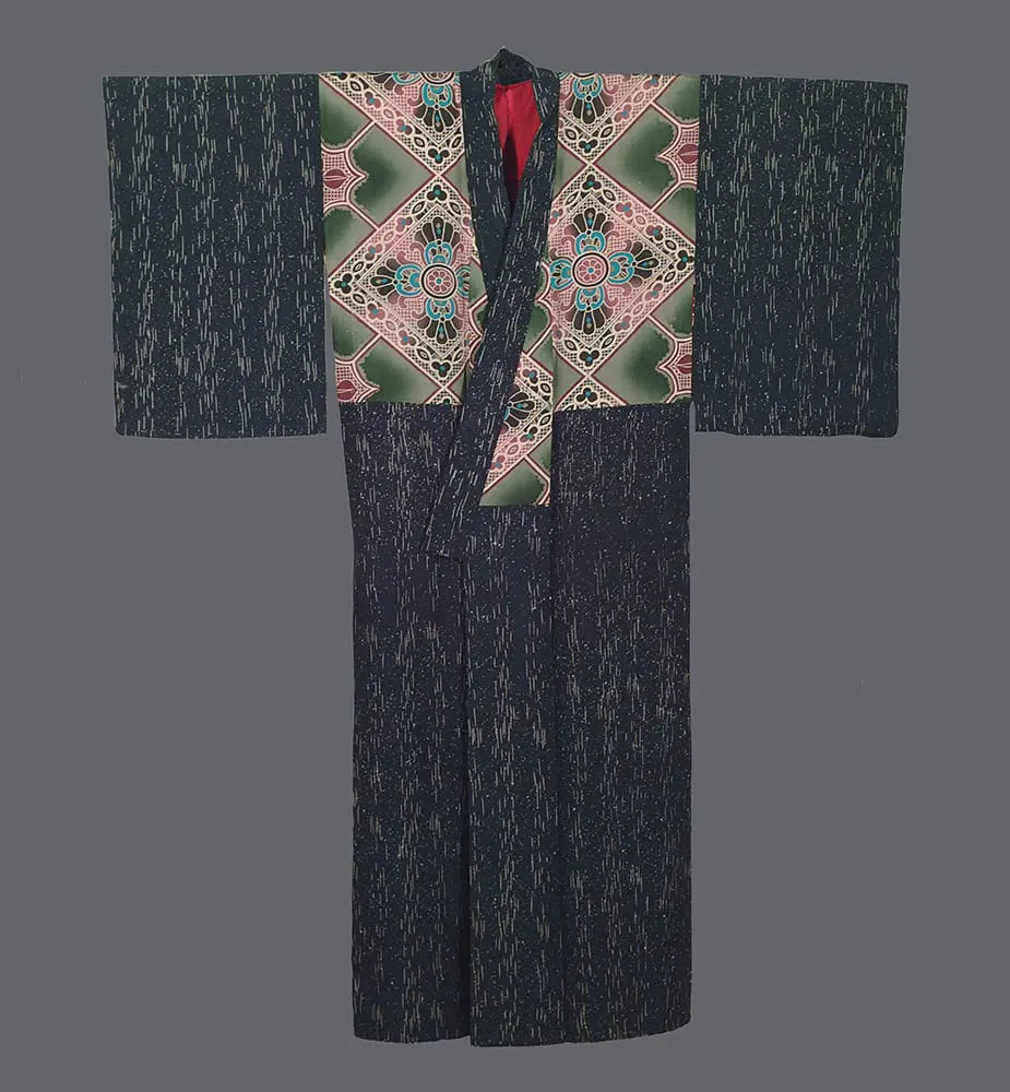 This elegant inner kimono demonstrates a masterful understanding of visual hierarchy, with the body and sleeves rendered in a subtle, textured dark fabric featuring a delicate vertical stripe or ikat-inspired pattern that provides understated elegance appropriate for an undergarment. This restrained approach to the primary surface creates a perfect foil for the dramatically ornate chest panel, where silkscreen printing technology has been employed to create an intricate geometric composition of remarkable complexity and precision.