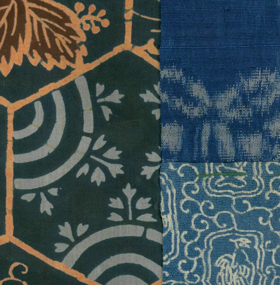 The surrounding blue sections showcase different textile traditions working in harmonious dialogue, with areas of kasuri (ikat) weaving creating subtle, blurred floral patterns that contrast beautifully with the crisp precision of the stencil-dyed central panel. The block-printed sections display yet another approach to surface decoration, demonstrating the period's rich diversity of textile production methods. This juxtaposition of techniques reflects the aesthetic philosophy of wabi-sabi, finding beauty in imperfection and impermanence, while the careful orchestration of these disparate elements reveals a sophisticated understanding of color harmony and pattern relationships.