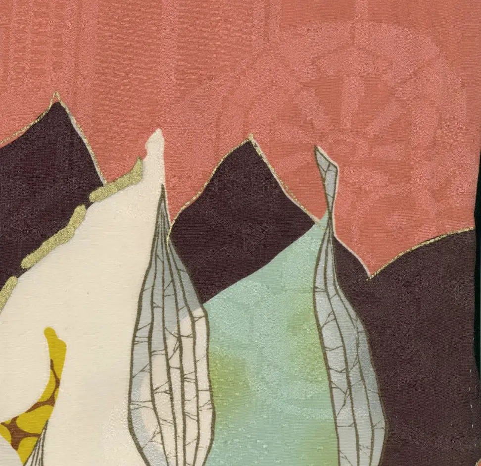 A vibrant coral-pink rinzu silk base provides a rich textural foundation for bold floral pattern. Large, stylized calla lilies arrange themselves in a rhythmic, repeating design across the warm salmon background. These lilies, depicted in shades of white, pale green, and black, create a bold contrast that draws the eye. The organic forms of the lilies and the flowing arrangement maintain a connection to nature that is characteristic of Japanese aesthetics. Additionally, the interplay of light and shadow within the calla lily motifs, created through the use of different shades and highlights, adds a three-dimensional quality to the design. This technique is reminiscent of the work of modernist artists who experimented with light and form to create depth and movement in their compositions. The black elements create dynamic shapes that enhance the overall composition and contribute to its modern feel. Subtle gold foil detailing at the lily edges adds an element of luxury and catches the light as the wearer moves. This haori design shares aesthetics principles with Art Deco and modernist movements of the early to mid-20th century. The stylized, geometric representation of the lilies shows a clear Art Deco aesthetic in its bold, simplified forms and repetitive patterning.