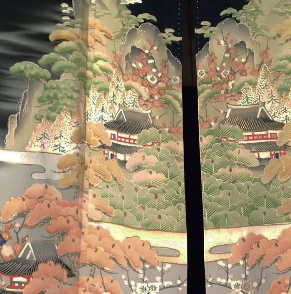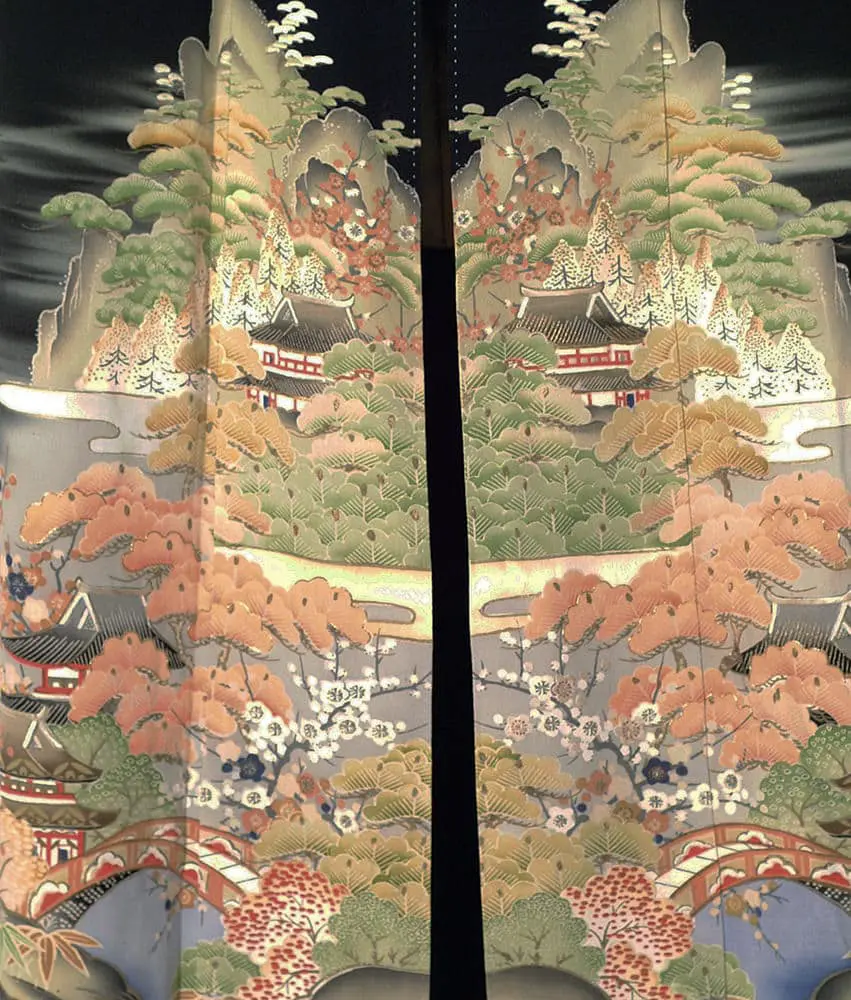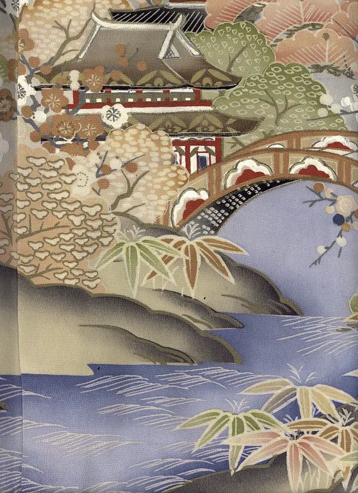 This kimono exemplifies the meisho-e (famous places) tradition in Japanese decorative arts, where idealized landscapes serve both aesthetic and cultural functions by evoking classical poetry and literary associations. The architectural elements suggest imperial or aristocratic settings, reinforcing the garment's ceremonial status, while the seasonal imagery speaks to the Japanese aesthetic concept of mono no aware—the bittersweet awareness of temporal beauty. The composition reflects influences from the Rinpa school's decorative style, with its characteristic use of gold clouds as compositional elements and its sophisticated balance between representational detail and stylized abstraction.