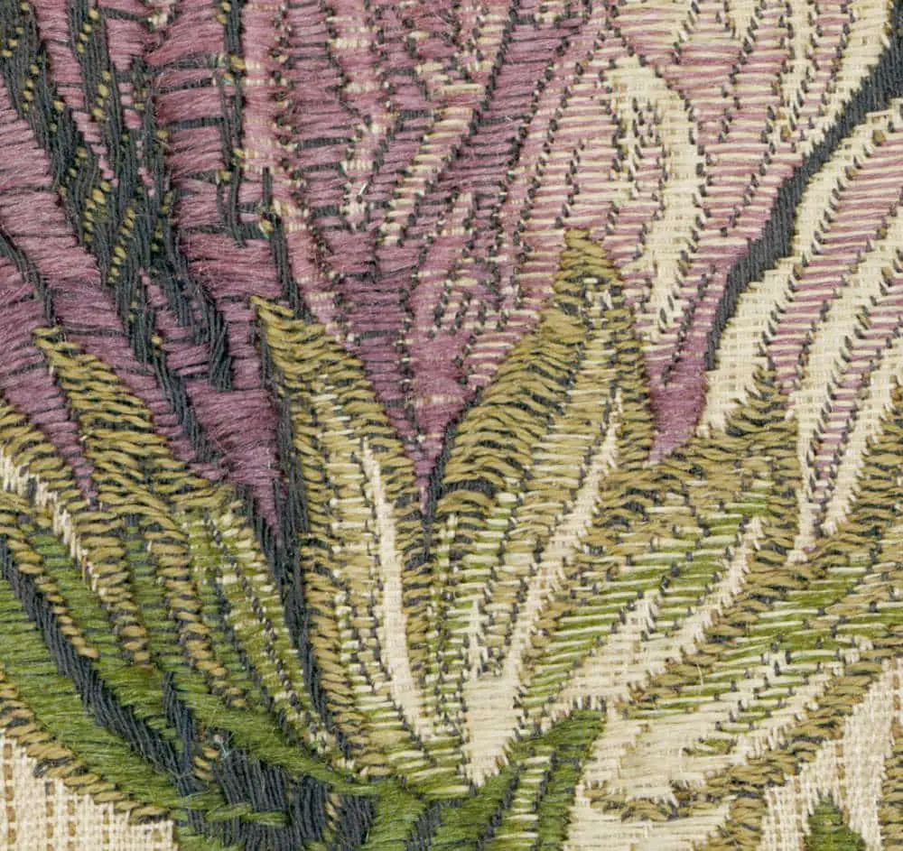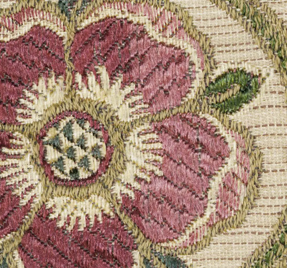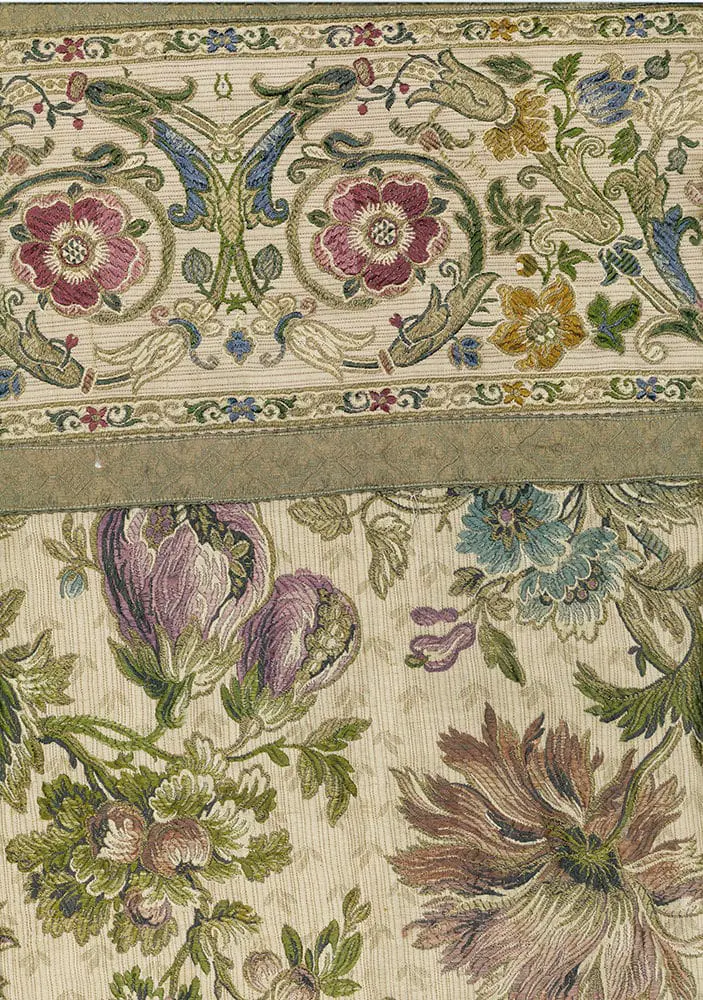 This sizable, uniquely shaped brocade textile has an ecclesiastical appearance. It showcases rich, three-dimensional brocade work and is in very good condition, although there are several stains that merge into the intricate pattern. Additionally, there's a tear on the fine silk back lining. Its dimensions measure 102 inches by 76 inches (259 cm x 193 cm).
