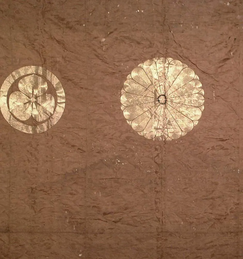 This Buddhist altar hanging showcases three significant metallic couching embroidery family crests against a brocade background crafted from silk. Its condition ranges from fair to good, yet it does bear several small holes and stains, visible in the provided images. The dimensions measure approximately 56 inches by 76 inches (142 cm x 193 cm).