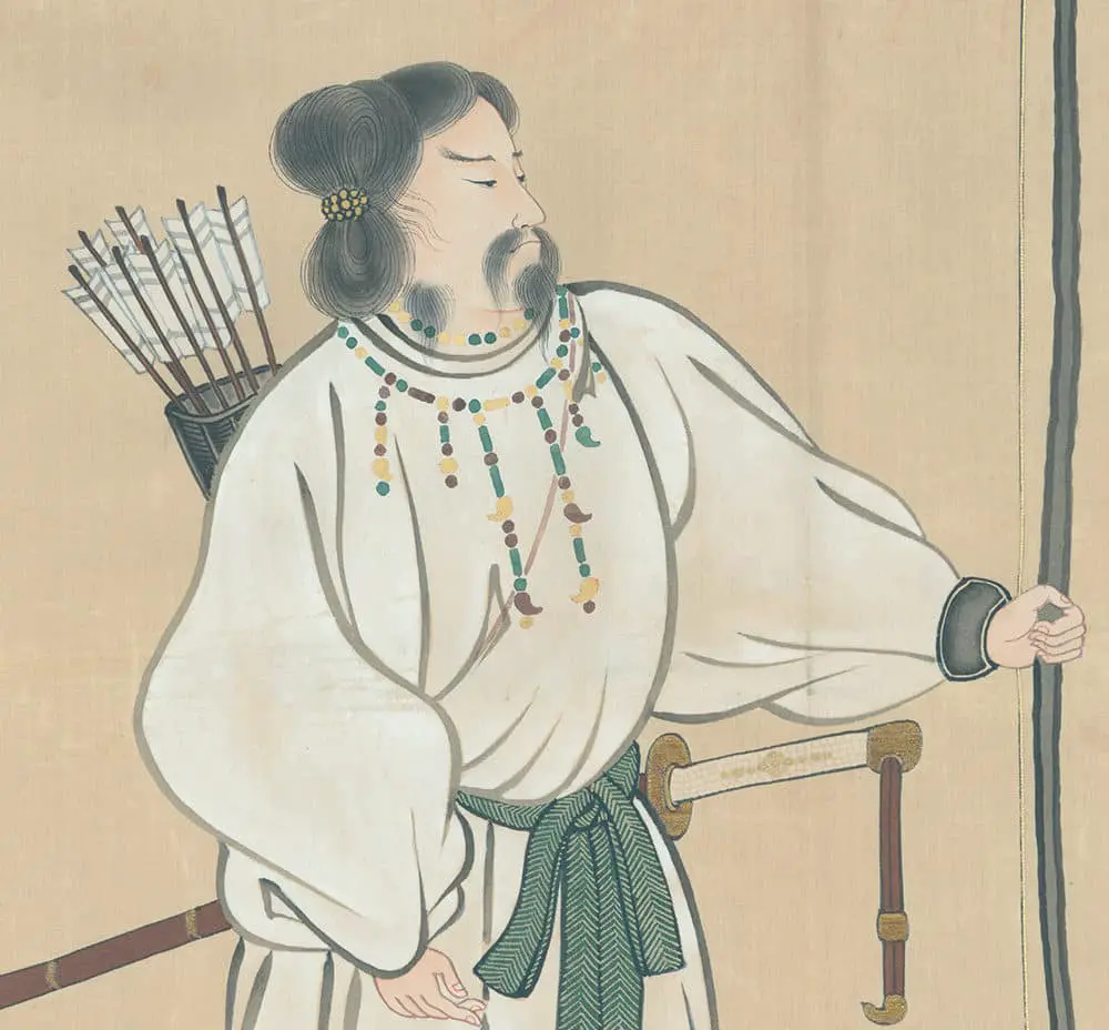 This silk fukusa displays exquisite yuzen-dyeing and embroidery, showcasing Jimmu Tenno, the inaugural Japanese Emperor. Legend has it that a hawk landed on Jimmu Tenno's bow, symbolizing triumph and expansion. In very good condition, though missing corner tassels, it measures 26 inches x 29 inches (66 cm x 73.5 cm). The origins of Japan's imperial lineage trace back to the mythical Divine Warrior Jimmu Tenno, believed to be directly descended from the Sun Goddess, Amaterasu. Early Japanese history remains somewhat ambiguous due to the absence of a writing system until the Heian Period, leading the Chinese to document many historical specifics. Records suggest Jimmu passed away at the age of 126. His posthumous name translates to "divine might" or "god-warrior," showcasing a Chinese and Buddhist influence, likely standardized centuries after Jimmu's era.